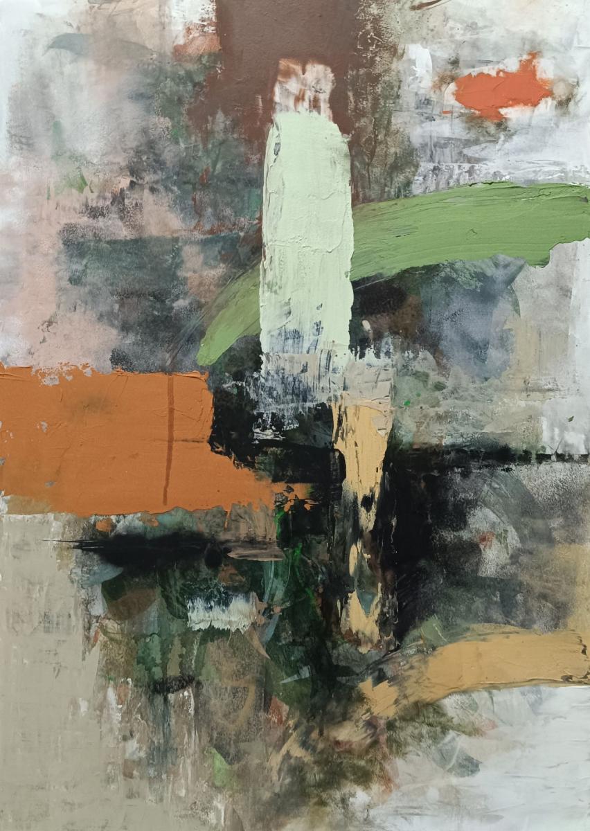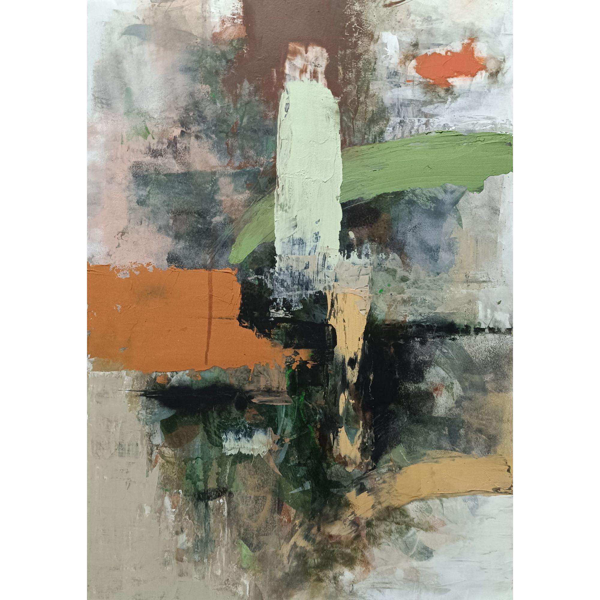 Quest'opera astratta di Accarò si distingue per la sua composizione dinamica, caratterizzata da pennellate audaci e stratificate. Al centro, un'imponente pennellata verticale verde chiaro e una orizzontale arancione creano un punto focale, intersecandosi con toni terrosi, verdi profondi e neri intensi. La texture materica è evidente, con spessi strati di colore che conferiscono profondità e movimento, mentre sfumature di bianco e grigio alleggeriscono lo sfondo, esaltando i contrasti cromatici.