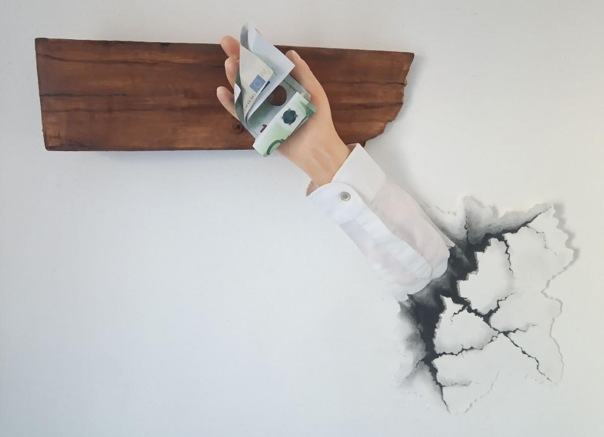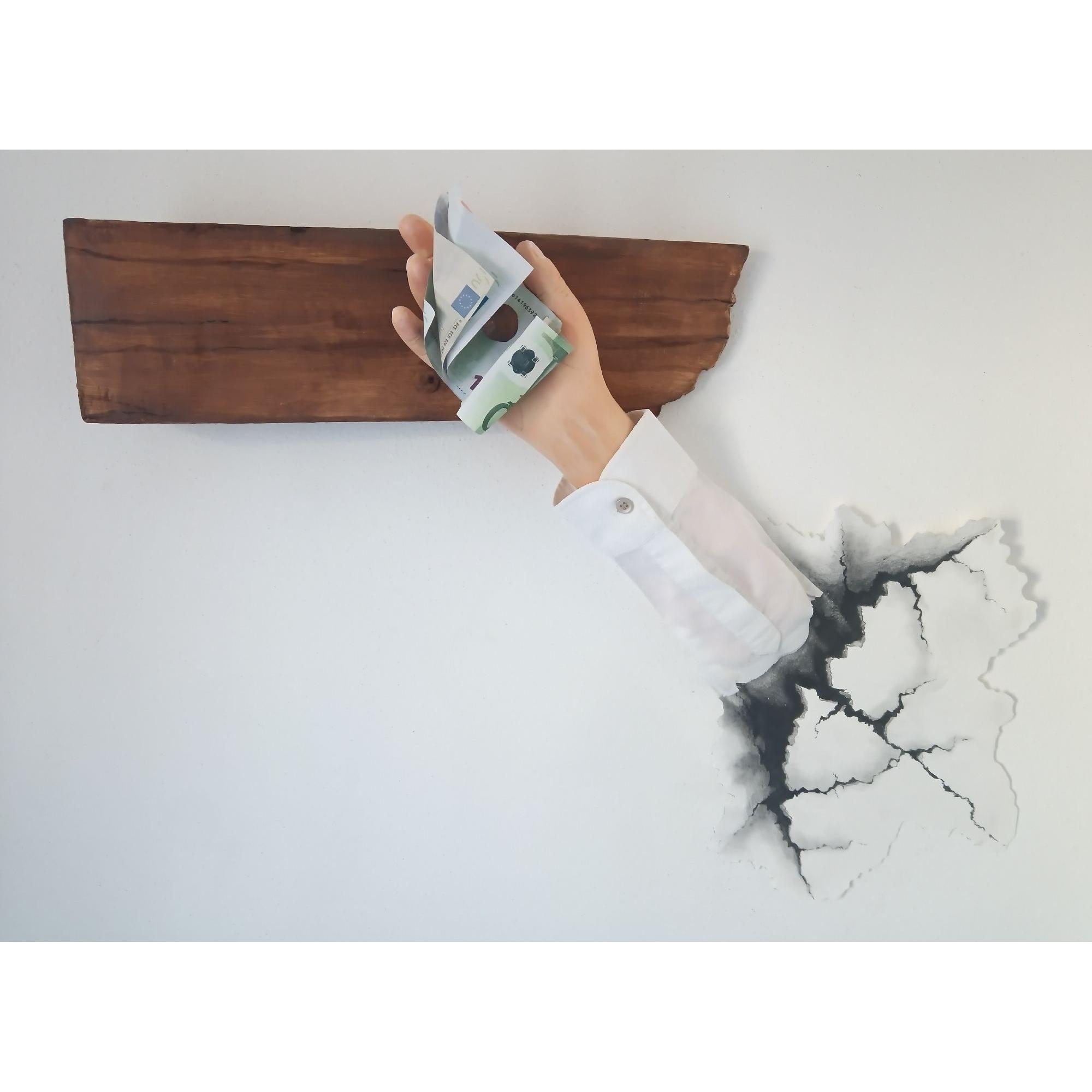 Opera realizzata in pittoscultura su tavola,con crepa muraria in grafica