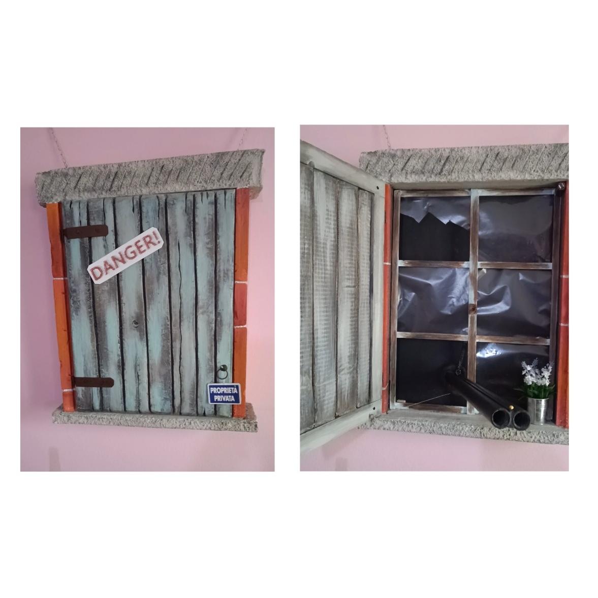 Opera realizzata su base di legno,con resine per contenere il peso totale di 3lg con anta apribile che aziona il meccanismo che porta le canne della doppietta (fucile) realizzata in legno, a scendere ed uscire dalla finestra, richiudendo l anta la doppietta ritorna nella posizione iniziale.