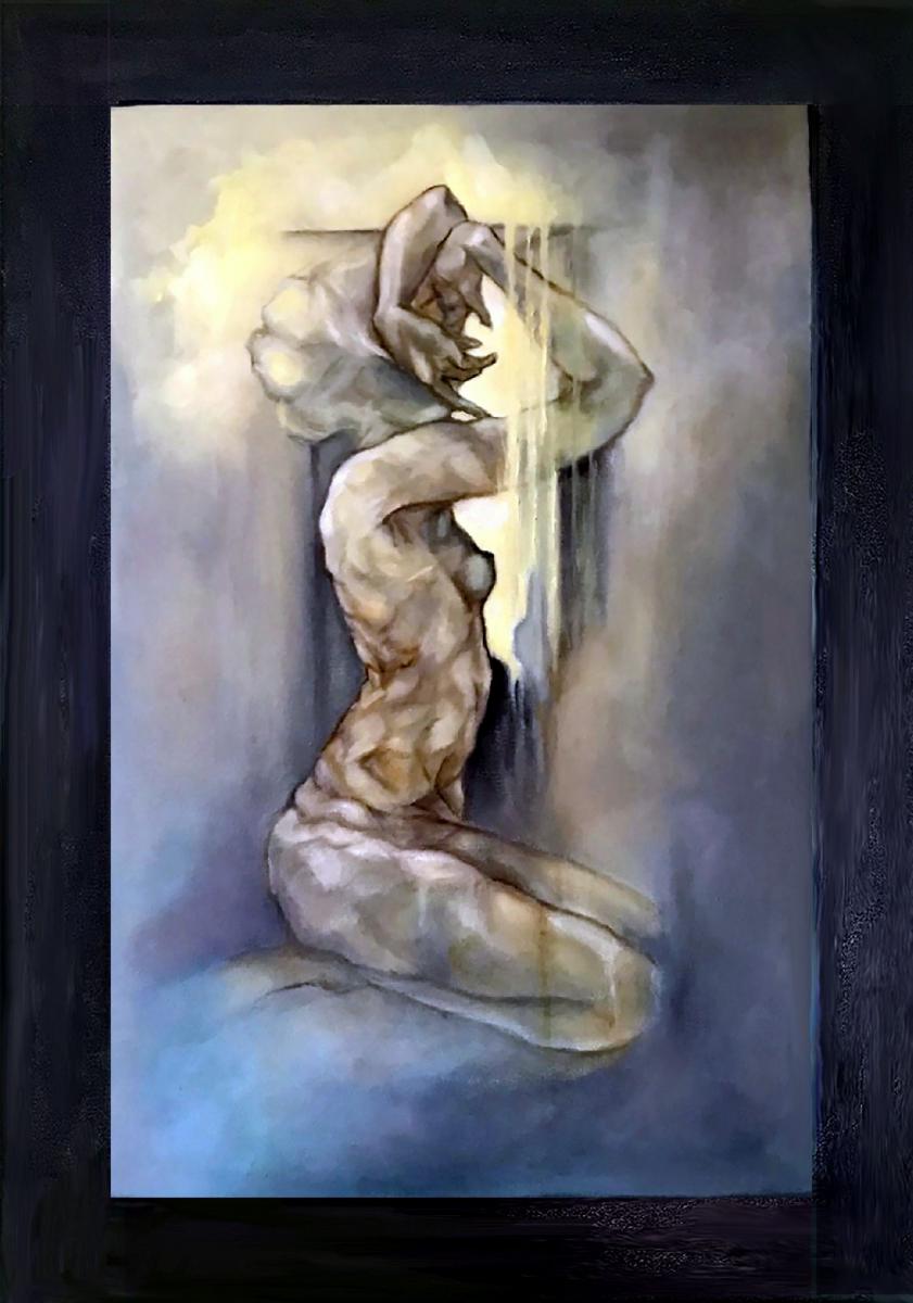 Figura femminili che sembra ripararsi dal chiarore di una luce. Esposta presso la Galleria "Circolo degli artisti Casa di Dante-Societàdelle belle arti. nel centro di Firenze per la mostra "Cosmogonia" il rapporto dell'uomo con l'Universo.