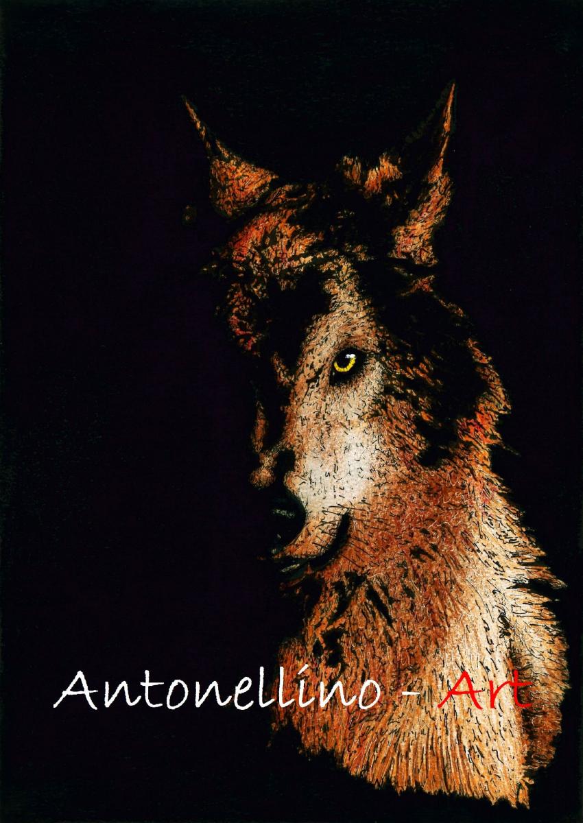 Lupo in primo piano, realizzato con tecnica mista a colori con sfumature d'inchiostro su cartoncino, simbolo di forza, istinto, libertà e guida, con una linea elegante e slanciata, dal muso allungato, con occhi penetranti e manto mimetico.