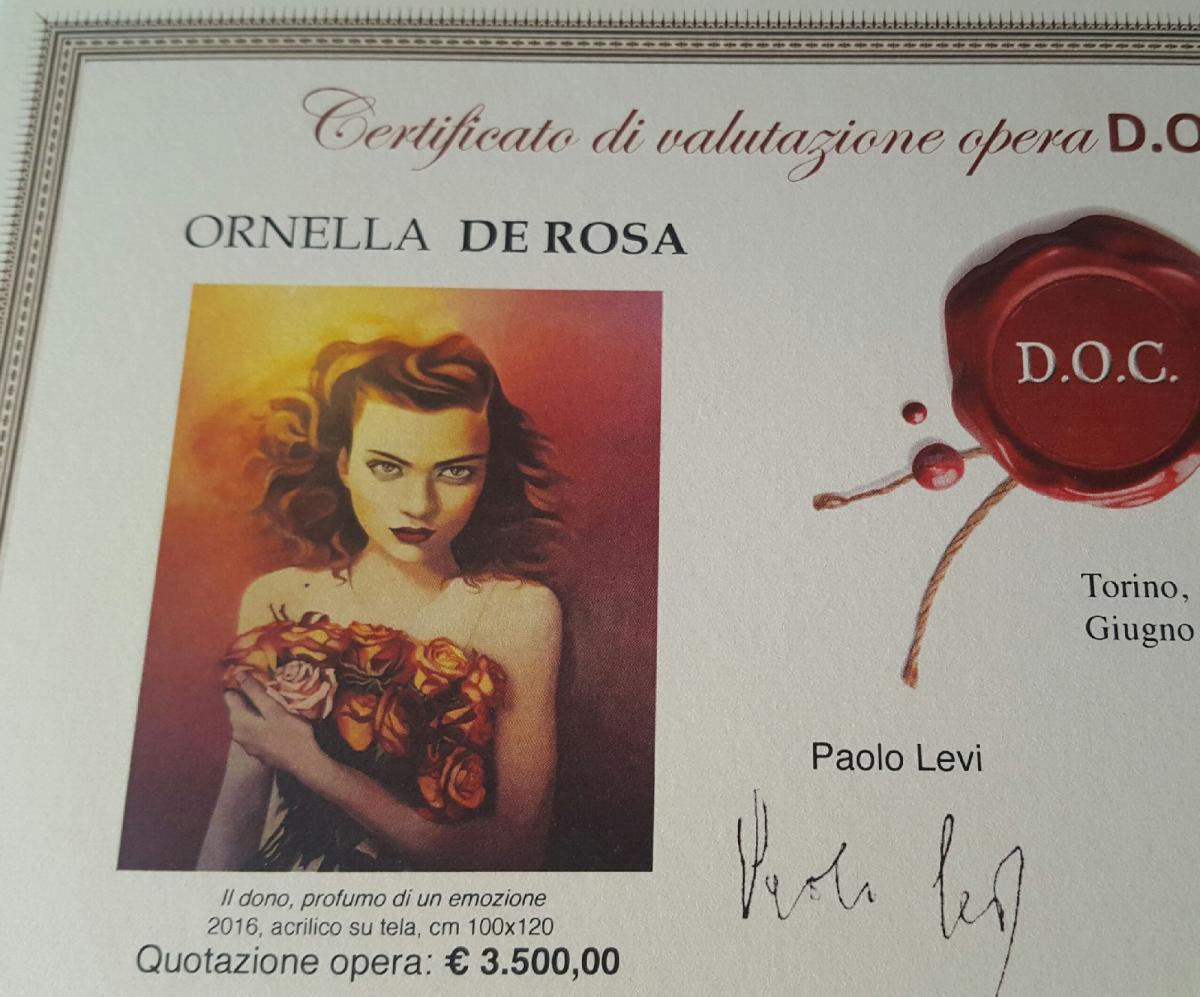 Valutazione dell'opera " IL DONO - PROFUMO DI UN'EMOZIONE " realizzata dall'artista Ornella De Rosa (DRO ARTE) in acrilico su tela - misure 100x120 redatta e sottoscritta dal prof. LEVI