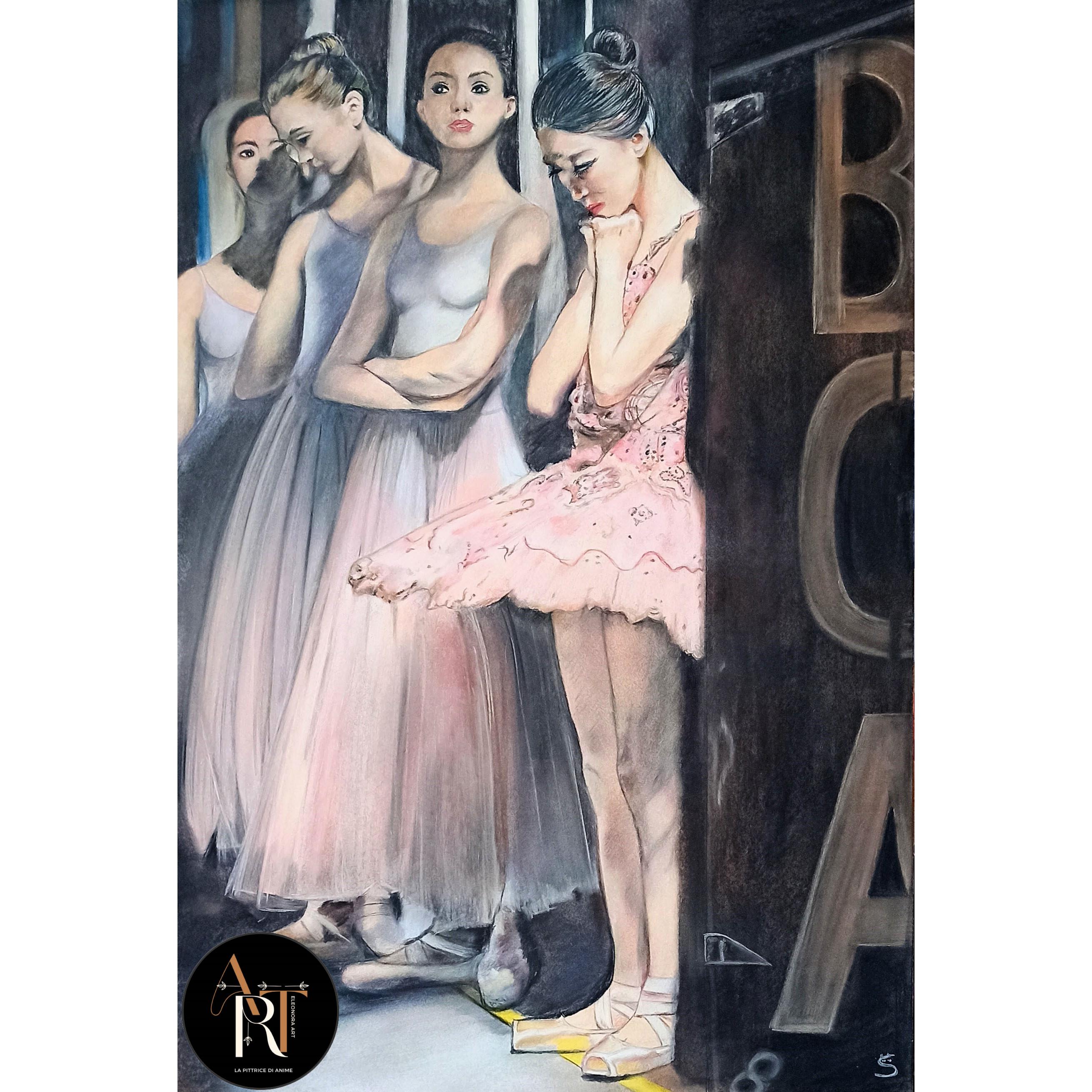 Il dipinto intitolato "Il giorno della prima" cattura un momento intimo dietro le quinte di un teatro. In primo piano, vediamo un gruppo di ballerine in attesa di entrare in scena. Tre di loro indossano eleganti tutù bianchi, mentre una spicca con il suo tutù rosa. Questa ballerina sembra essere al centro dell'attenzione, con le mani che toccano il viso in un gesto che potrebbe riflettere nervosismo, concentrazione o forse l'emozione del momento. Le altre ballerine sono posizionate leggermente in secondo piano, con una che incrocia le braccia, quasi a significare una quieta aspettativa. L'intera composizione trasmette una sensazione di attesa e preparazione, tipica del dietro le quinte di uno spettacolo di danza.