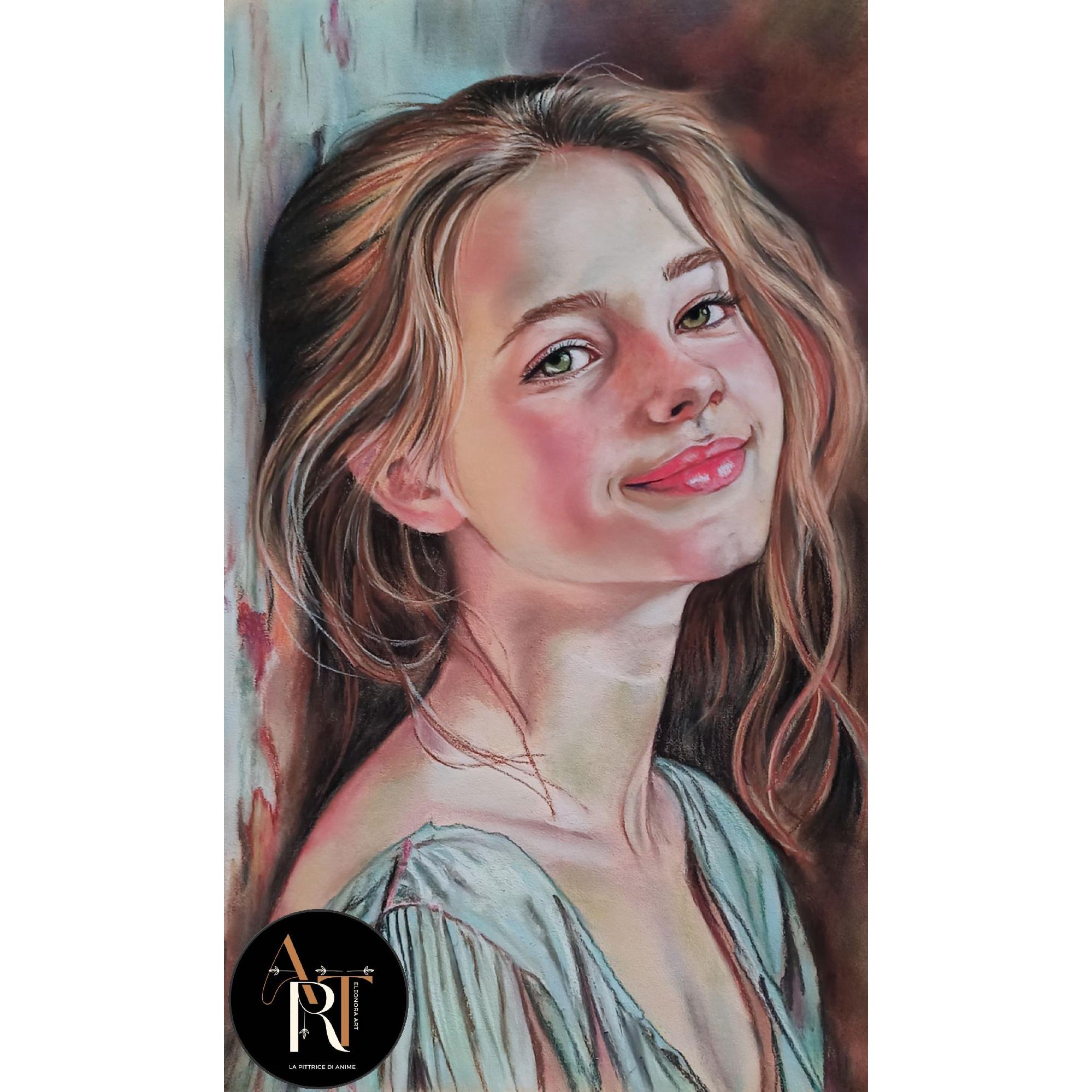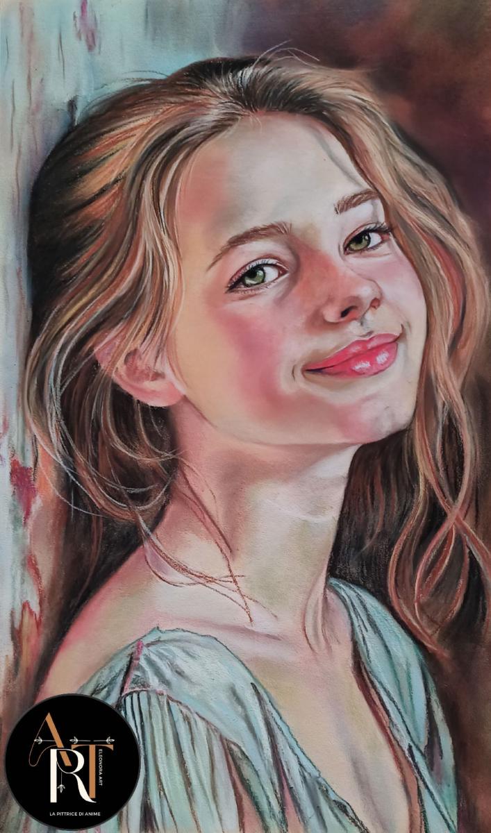 In questo volto si riflette la quiete di un pensiero non detto. Lo sguardo, diretto ma gentile, sembra cercare un dialogo silenzioso con chi osserva. I capelli mossi, come onde leggere, incorniciano un’espressione che vibra tra la malinconia e la speranza.
