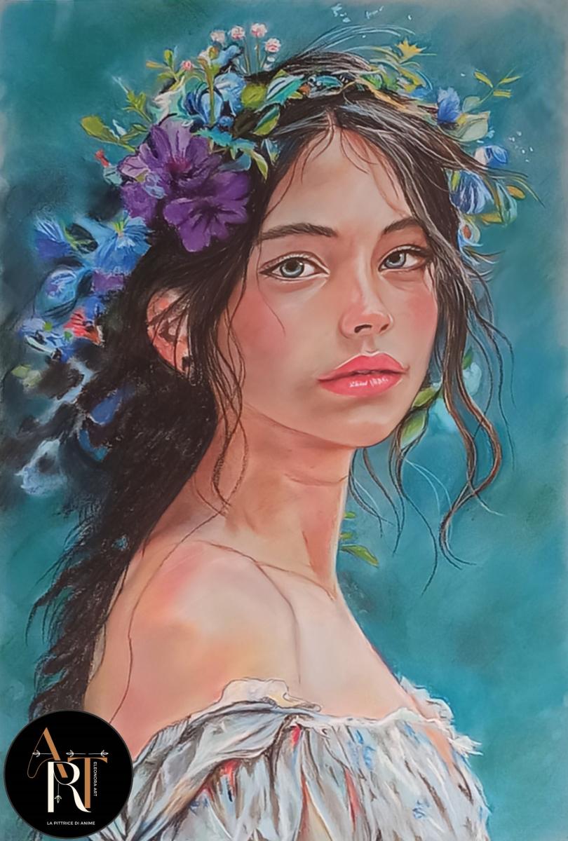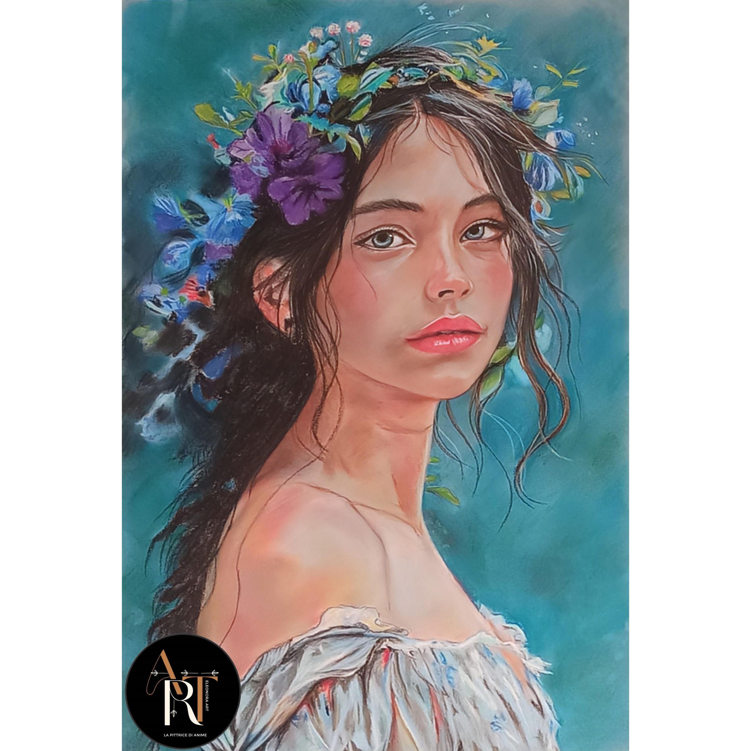Tra sogno e realtà Come sbocciata da un pensiero gentile, la figura femminile emerge da un campo immaginario dove i fiori raccontano segreti e lo sfondo respira silenzi. Lo sguardo, leggermente velato da contemplazione, non cerca il mondo fuori, ma quello dentro. I pigmenti danzano leggeri come vento su pelle, e il pastello si fa voce di un frammento di sogno che ha deciso di prendere forma. Qui, il confine tra immaginazione e presenza non è una linea, ma una sfumatura.