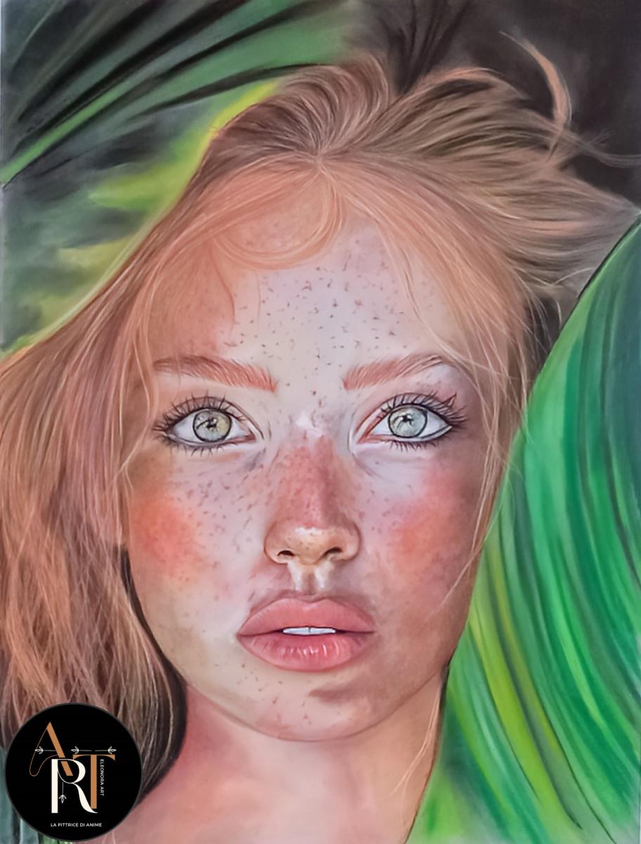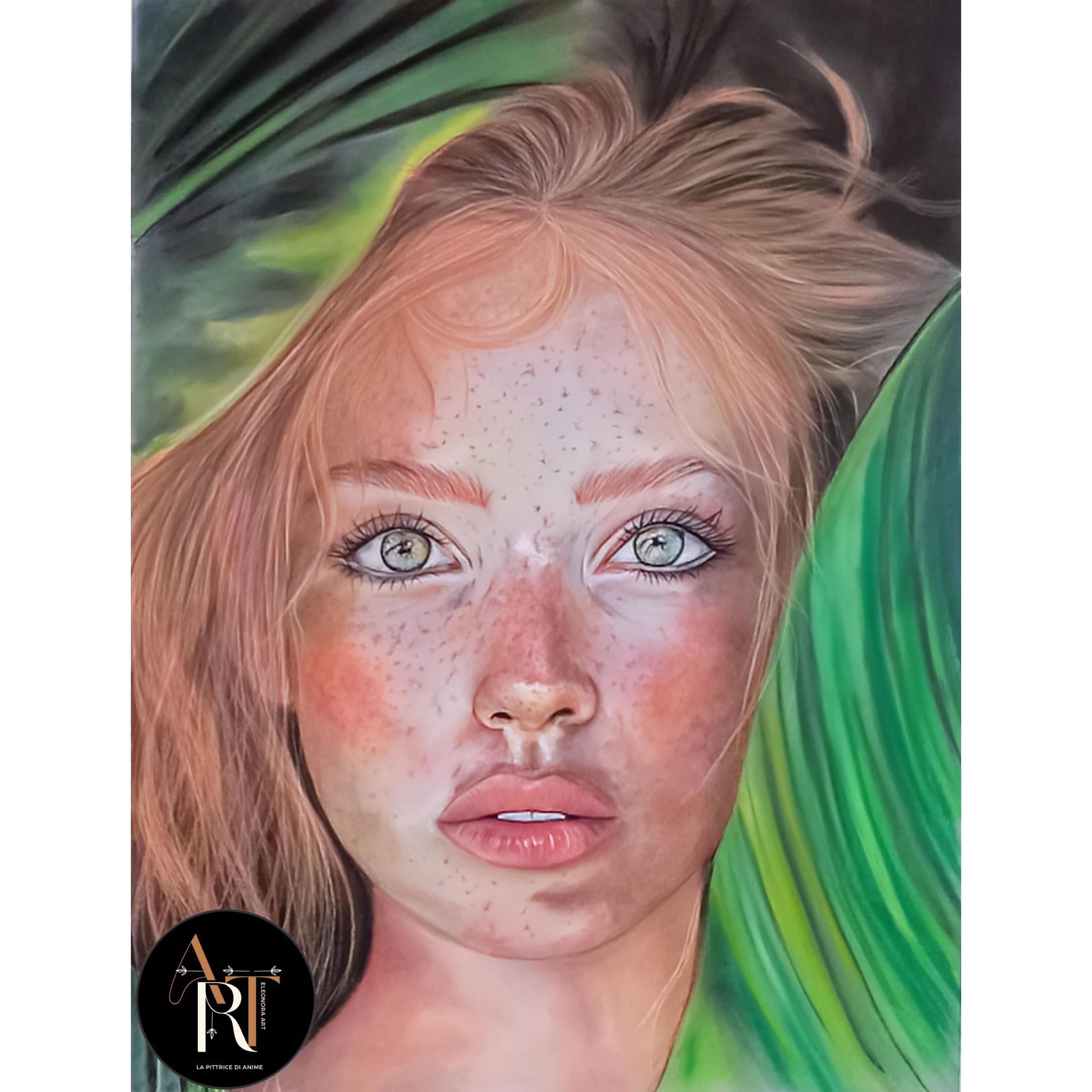 Immagina di trovarti di fronte a un sussurro di luce: EVA è un ritratto che pare catturare l’istante in cui l’alba sfiora la pelle. I capelli biondo rossi non sono semplici ciocche, ma lingue di fiamma soffice che si intrecciano con un alone verde smeraldo, come radici che affondano nel cuore della natura. Il volto di EVA si rivela in tutta la sua intensità: una pelle sfumata, che contrasta splendidamente con quegli occhi grigio-verdi vivi, nitidi come gocce di rugiada su una foglia, quegli occhi non sono un semplice dettaglio: sono il cuore pulsante del dipinto. Il grigio richiama i veli dell’alba, mentre il verde porta con sé un’eco di boschi ancora addormentati. In quei due punti di intensità si insinua la storia di EVA, un racconto che cammina sul confine tra la purezza dell’origine e la curiosità per l’ignoto. La morbidezza del pastello avvolge ogni dettaglio, trasformando la materia in un delicato ponte tra realtà e visione.