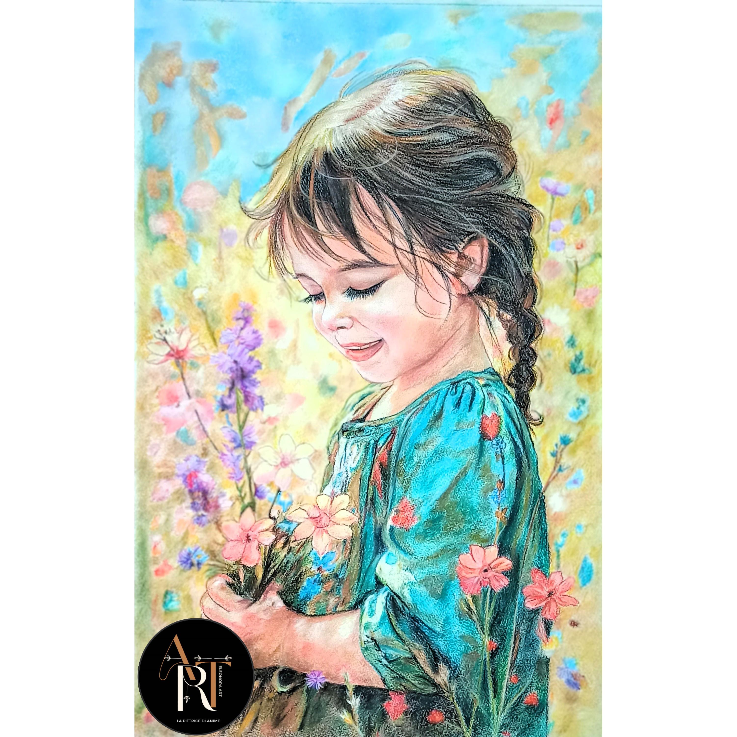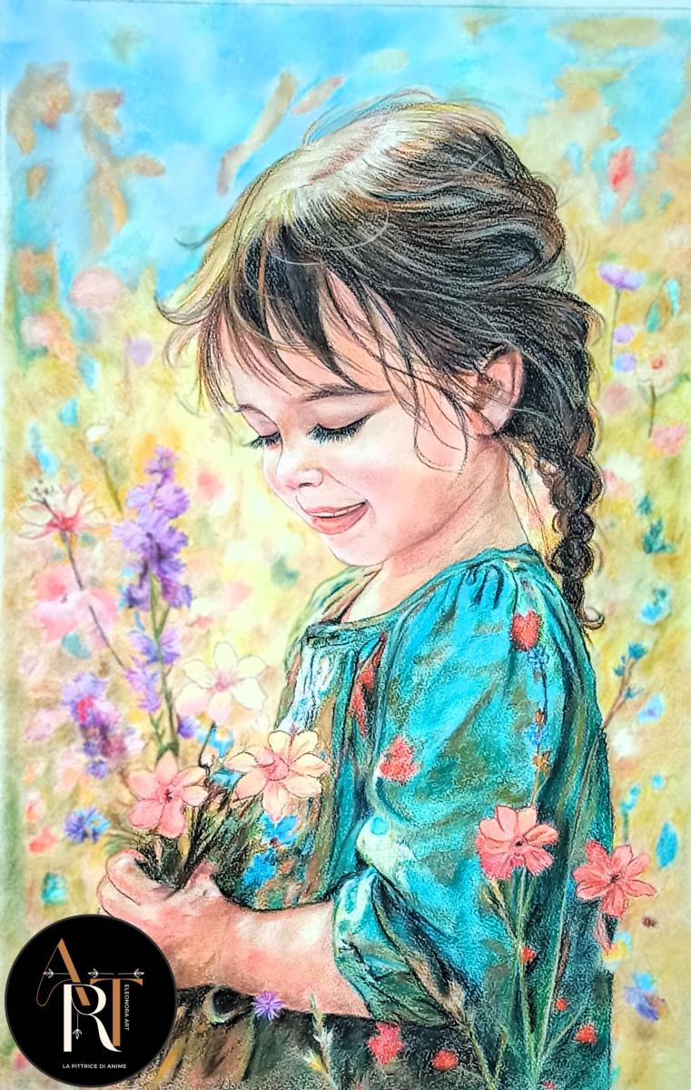 C’è un attimo, fragile e perfetto, in cui la felicità sboccia senza rumore. Tra i colori gentili della natura, un sorriso nasce spontaneo, come un fiore che si apre al sole. Il vento sfiora la pelle, i petali danzano, e il tempo si ferma non per essere ricordato, ma per essere vissuto.In questo dipinto, la luce non illumina soltanto il volto: accarezza l’anima. Ogni sfumatura racconta la dolcezza di un giorno qualunque, reso eterno da uno sguardo sereno. È la poesia delle piccole cose, quella che non ha bisogno di parole. Solo di silenzio, di colore, e di un sorriso tra i fiori.