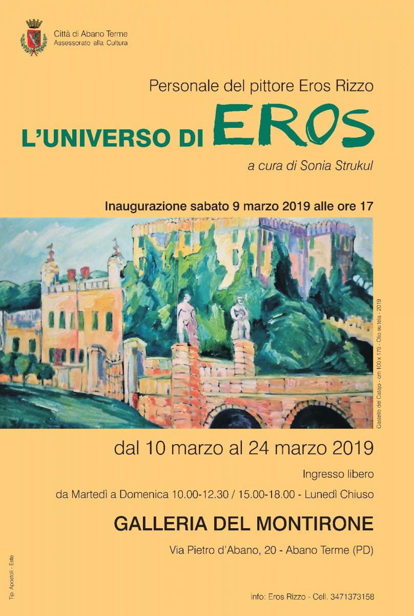 In questa personale presso il Padiglione del Montirone di Abano Terme, del pittore Eros Rizzo, vorrei far conoscere non solo i paesaggi, gli scorci di Este e del territorio euganeo, i fiori, in particolare le rose, per i quali questo artista è conosciuto e apprezzato. Ma anche le figure , i volti, che a mio avviso sono la parte più interessante della sua produzione, perchè gli vengono da dentro, con urgenza e impeto dipinge figure e volti espressionisti, in quanto ricordano i maestri di questa corrente pittorica nella scelta cromatica i nell' incuranza nel rispettare le proporzioni anatomiche, ma restituendoci un' intensità emotiva che fu il comune denominatore di una certa pittura a cavallo tra 800 e 900 fino circa la metà del 900. Questa mostra vuole mostrare a tutto tondo il lavoro di questo artista, non mancheranno anche gli schizzi a penna che Eros Rizzo esegue prima di affrontare la tela, sopratutto quando l' opera pittorica richiede impegno. Sonia Strukul