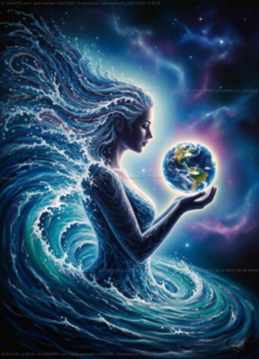L'opera intitolata "Anima Mundi" di Euranie Cryzz è presentata in esclusiva al Panorama International Arts Festival 2025; si presenta come una potente allegoria visiva in cui la figura femminile, interamente costituita da acqua, emerge da un vortice oceanico e regge il pianeta Terra tra le mani. La scena è avvolta da un cosmo blu e violaceo, attraversato da bagliori e nebulose, in cui il mare e lo spazio si fondono in un continuum cromatico. La composizione adotta uno schema centripeto: il vortice conduce lo sguardo verso la mano e il globo, punto focale assoluto, reso con colori più vari e luminosi rispetto al resto dell’immagine. La luce proviene dal pianeta stesso, che irradia un’aureola attenuata sul volto della figura, creando un effetto di controluce morbido e avvolgente. La linea del corpo descrive un’ampia curva a “S” che armonizza dinamismo e grazia, mentre la capigliatura si dissolve in onde e spuma, conferendo continuità visiva tra figura e ambiente.