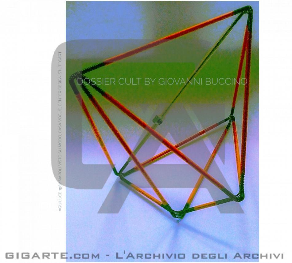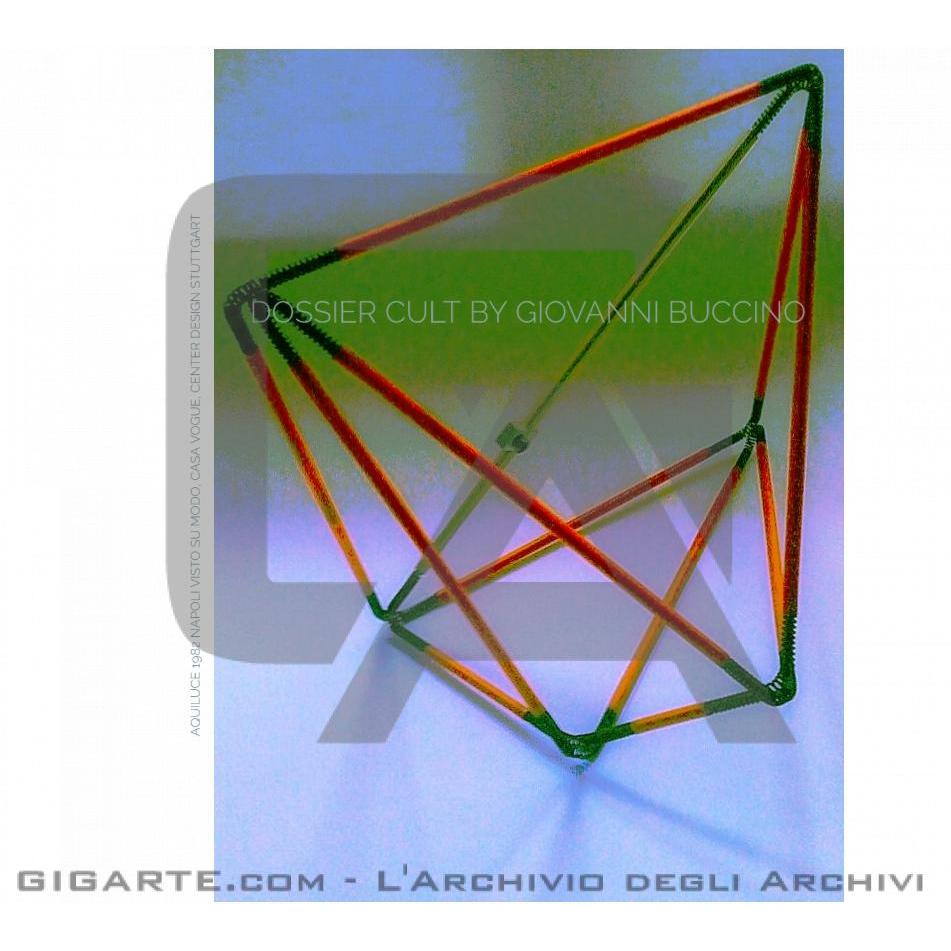 Acciaio, rivestito con tubicini gomma Fluorescente da luce Wood, nodi spaziali in filo armonico bruniti, la geometria spaziale e la forma adottata da programmi e soluzioni architettoniche come ideali del Nodo Mero. Infatti È un oggetto scultoreo, di illuminotecnica, completamente smontabile/rimontabile studiato per comporre una maschera che lavoravo con legno di Balsa, come si costruisce i velieri, asticella che sovrapposte l'una sull'altra e lavorate come piume di ali di uccello. Questo ci condusse a semplificare la costruzione strutturale laddove occorre per le successive lavorazioni delle "piume in legno". Questa forma ricorda il tetto delle case in Svizzera, una sull'altra le aste formano inclinazioni di varia forma e pendenza. Curioso il fatto che se sganci lasta d'acciaio, dalla base quadrata, del nodo spaziale, l'opera si flette e si chiude come lo "Schiaffo di carnevale" che trovavi tra gli scherzi di Napoli; era in carta/cartoncino, questa funzione non era prevista, uscita per caso. Il concetto costruttivo e il progetto era e resta di base geometrica.