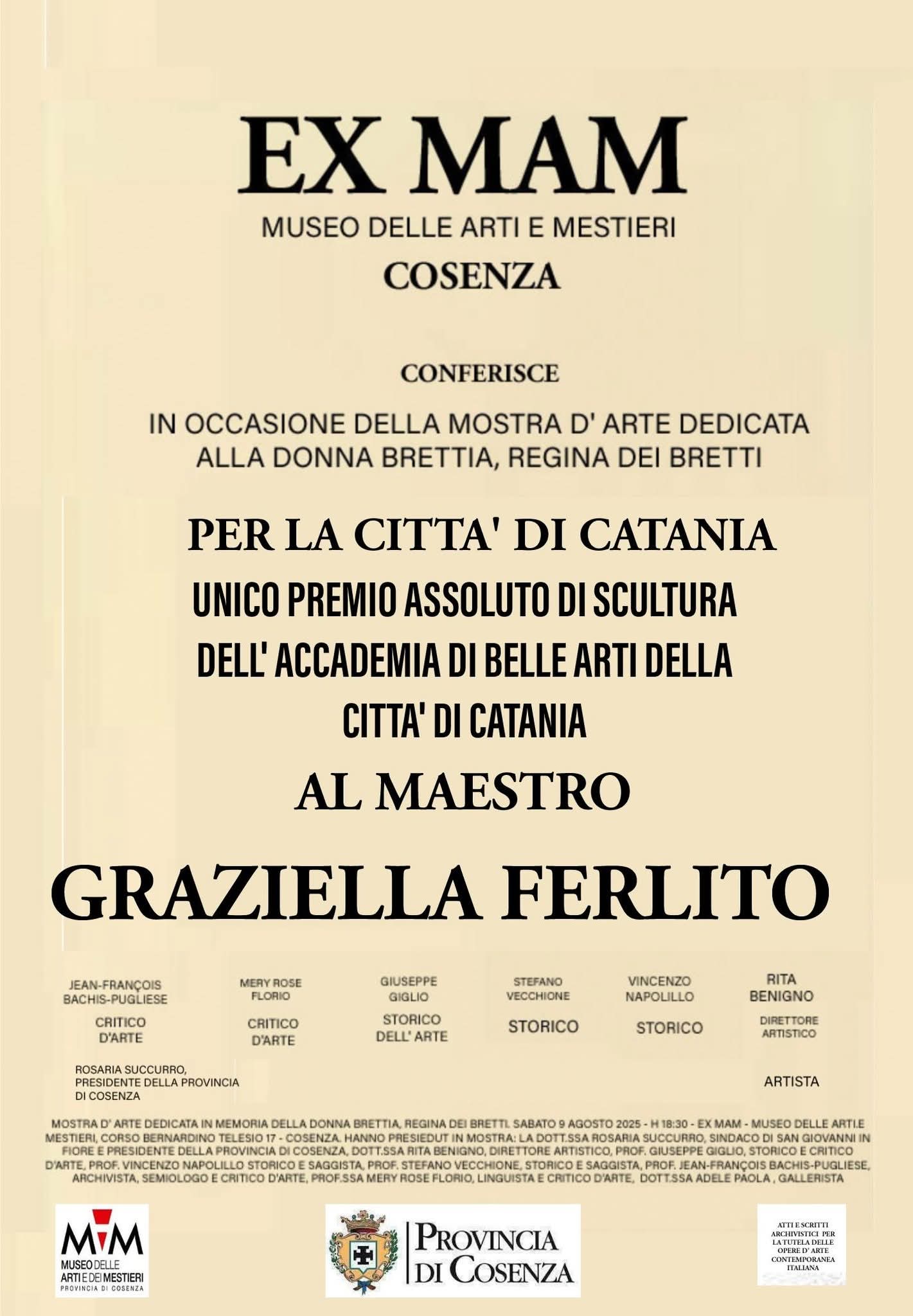 Istruzione e formazione: 18 Luglio 1992 Diploma di maturità artistica, conseguita presso il Liceo artistico di Catania.29 Aprile 1997 Diploma Accademia delle belle Arti di Catania,sez. Scultura.Pubblicazioni:1993 Quadri e Sculture; 1994 Galleria Italia; 1998 Sotto il Vulcano; 1996/97 Dizionario Enciclopedico d'arte Contemporanea; 2019 100 Artisti Emergenti di Antonio Castellana; 2022 Artisti 2022 di Silvia Landi.Ars Magistris Magazine; 2024Pittrice, scultrice, decoratrice e restauratrice su commissione e privati dal 1992.Scrittrice, autrice del romanzo Il palazzo di via Malcontenti, ediz. Albatros, il filo, 2023.Maestra di scultura presso Comitato Santantonese, anno 2017.Esposizioni recenti personali e collettive a:Collettiva,Bevagna 2022Collettiva,Abbazia di Farfa, 2022Personale,CCM Museum, villa delle Arti 2022Personale di pittura,Abbazia dei santi Felice e Mauro, Sant'Anatolia di Narco, 2022Artbox Projects Miami, 2022Bipersonale Villa Reimann Siracusa, 2023Personale al CCM Museum villa delle Arti,2023Artbox Projects a New York, 2023.Pubblicazione del libro Il Palazzo di via Malcontenti, di Graziella Ferlito, 2023, gruppo Albatros il Filo, narrativa.Esposizione collettiva a Milano, Spazio Tolomeo con Megartgallery, 2023Esposizione collettiva al MAM di Cosenza, a tema Hecate, direttore artistico prof.Gianfranco Pugliese, prof. Giuseppe Giglio e prof. Rose Marie Florio, anno 2024.Catalogazione presso archivio storico dell' arte contemporanea italiana di Cosenza. Testi critici del prof. Pugliese Gianfranco, prof. Giuseppe Giglio e professoressa Rose Marie Florio e inserimento nei cataloghi Tomo 1,2,3,4 edizione ADTeditori, testi storici per la tutela del patrimonio artistico italiano.Esposizione collettiva presso Museo Marca di Catanzaro, a cura della dottoressa Tania Romeo a tema: Volcano, anno 2025.Premio alla carriera rilasciato dal Museo Marca di Catanzaro.Premio assoluto sezione scultura rilasciato dal Museo MAM di Cosenza.Esposizione collettiva presso Museo MAM di Cosenza a tema: la donna Brettia, anno 2025Esposizione alla Biennale di Messina 2025.