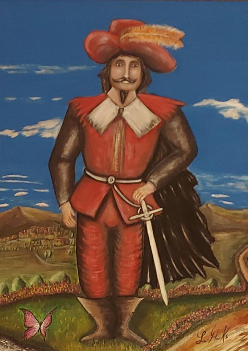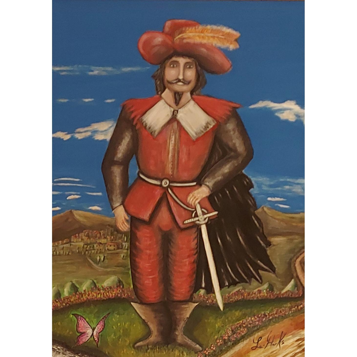 Don Rodrigo "I Promessi Sposi"Nel mio dipinto ho rappresentato Don Rodrigo, un personaggio importante dei Promessi Sposi. Ho voluto dargli un aspetto elegante ma anche minaccioso, per mostrare il suo potere e il suo carattere autoritario.L’ho vestito di rosso, con pantaloni e giacca dello stesso colore. Il rosso rappresenta la rabbia, l’orgoglio, la passione ma anche il pericolo e la violenza. Gli stivali marroni mostrano che è un nobile legato alla terra, concreto e potente. Sulla testa ha un cappello con una piuma, simbolo di nobiltà e vanità: Don Rodrigo tiene molto alla sua immagine.Lo sfondo è un paesaggio di montagna con cielo azzurro e nuvole: rappresenta la pace e la libertà, che lui ostacola, ma che esistono comunque intorno a lui.Vicino a lui ho dipinto una farfalla: simbolo di purezza, fragilità e libertà. Rappresenta Lucia, che lui vuole controllare ma che gli sfugge, proprio come una farfalla. Questo piccolo dettaglio porta luce e speranza nel dipinto, contrastando con la durezza del personaggio.