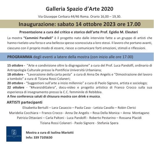 Da sabato prossimo 14 ottobre sarò presente con tre mie opere in una collettiva a Roma in Via G. Cerbara 44/46 (zona Tor Marancia). Inaugurazione sabato alle 17:00 e un mio intervento Domenica 15 ottobre sempre alle 17:00. Vi aspetto… (La mostra è curata da Isolina Mariotti)