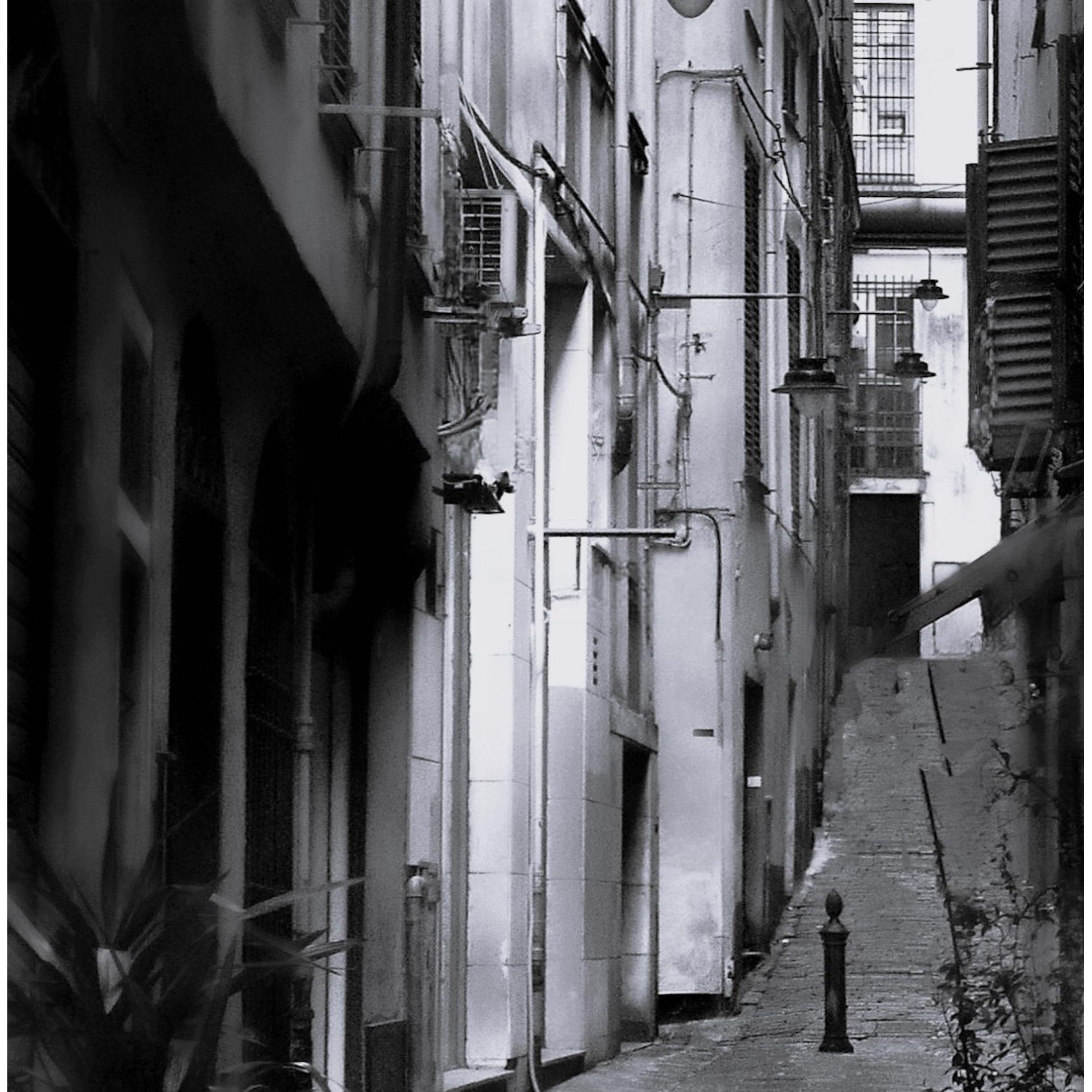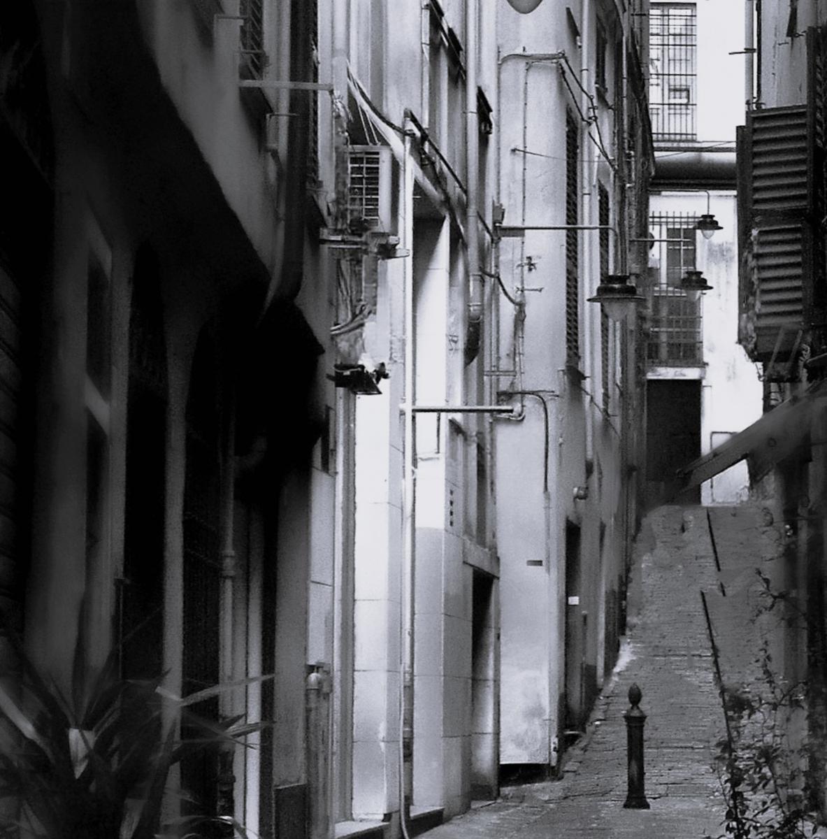 Fotografia in bianco e nero di un vicolo in un paesaggio urbano