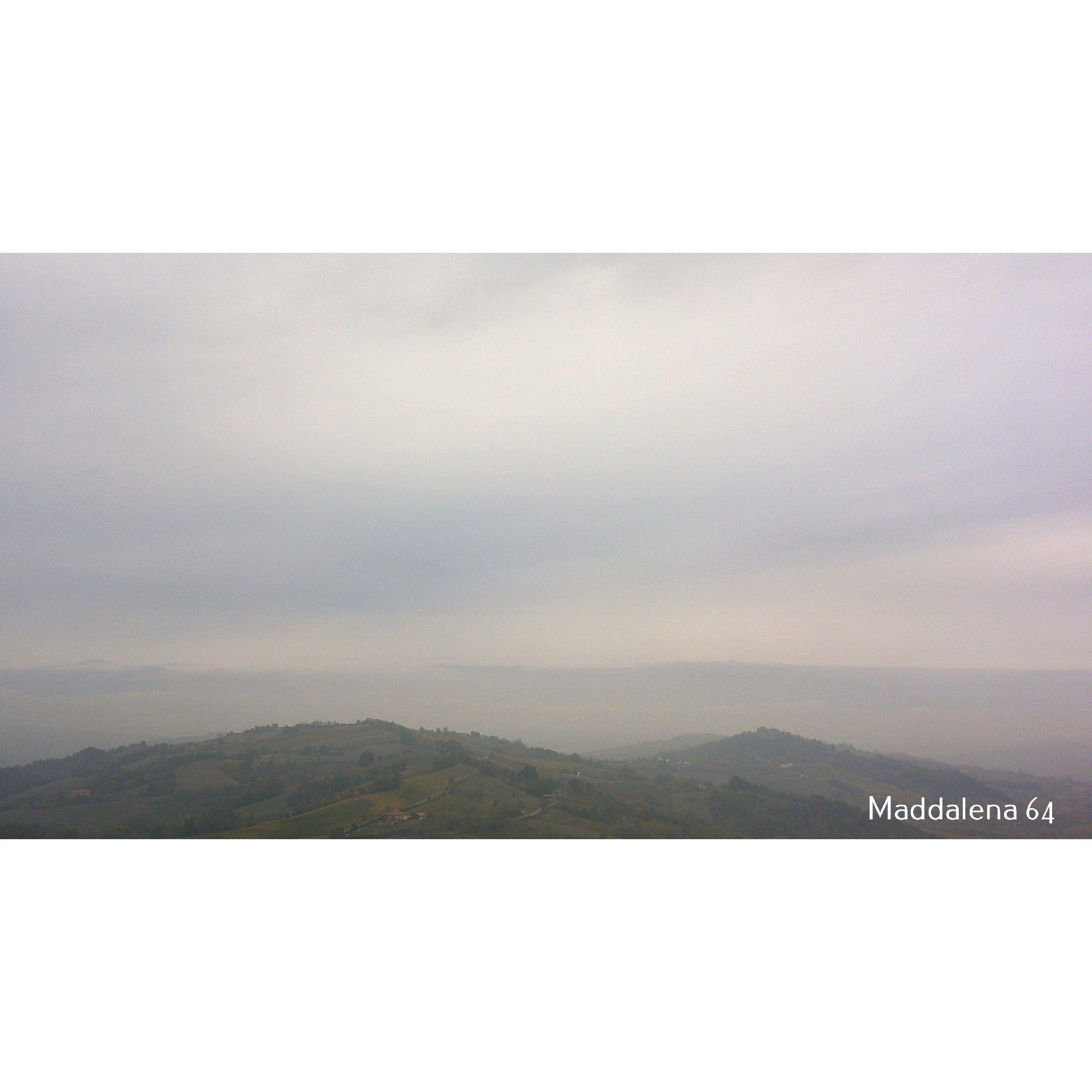 Dolci colline, foschia all'orizzonte, pomeriggio piovoso, nuvole gonfie di pioggia...