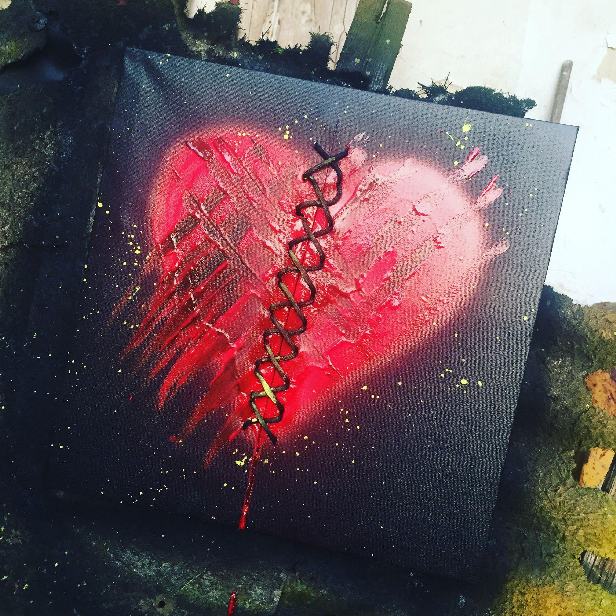 L’opera rappresenta un cuore rovinato, graffiato, deformato da molti dispiaceri, è tagliato in due, ma ricucito da un laccio nero, sullo sfondo sono presenti macchie gialle ad indicare anche piccoli momenti di serenità.