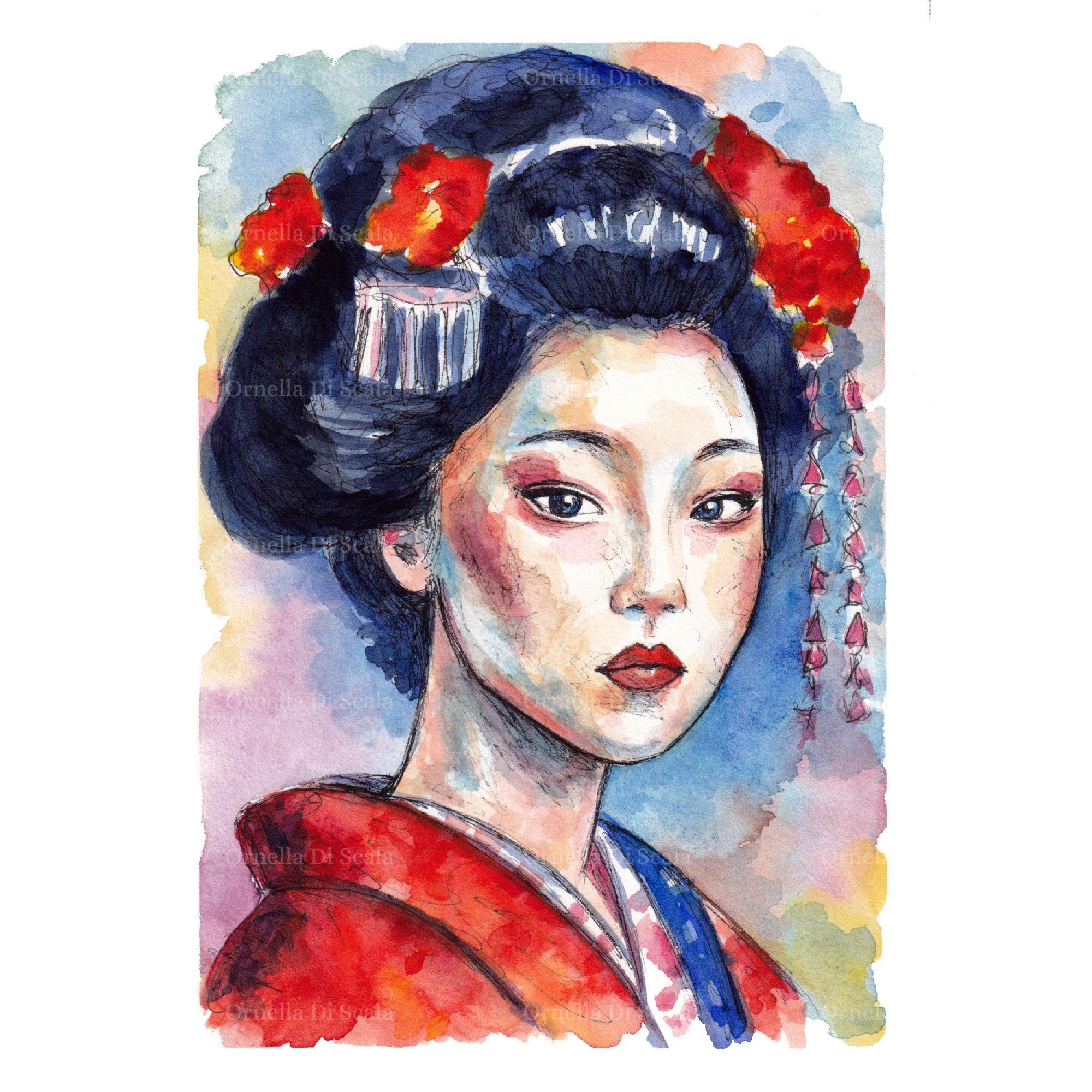 Geisha acquerello e china ,dipinto a mano su carta Arches A5 (15x21 cm circa)