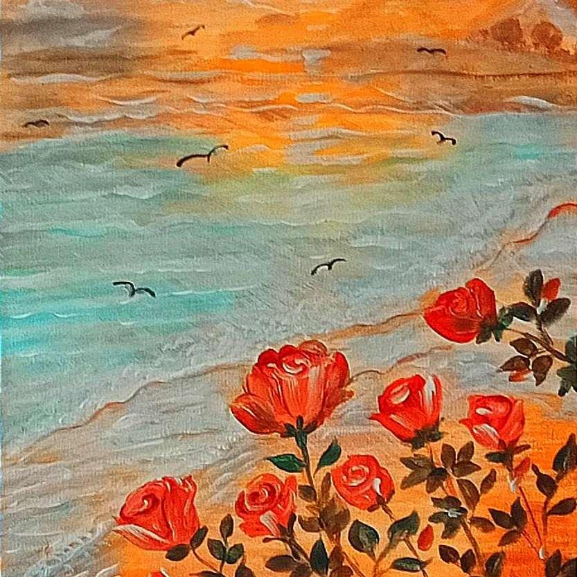 - Gestualità dell'Acrilico: Si nota una stesura materica, specialmente nelle creste delle onde e nei petali delle rose. Le pennellate sono brevi e decise, tipiche di una tecnica che cerca di catturare l'impressione luminosa più che il dettaglio fotografico.
