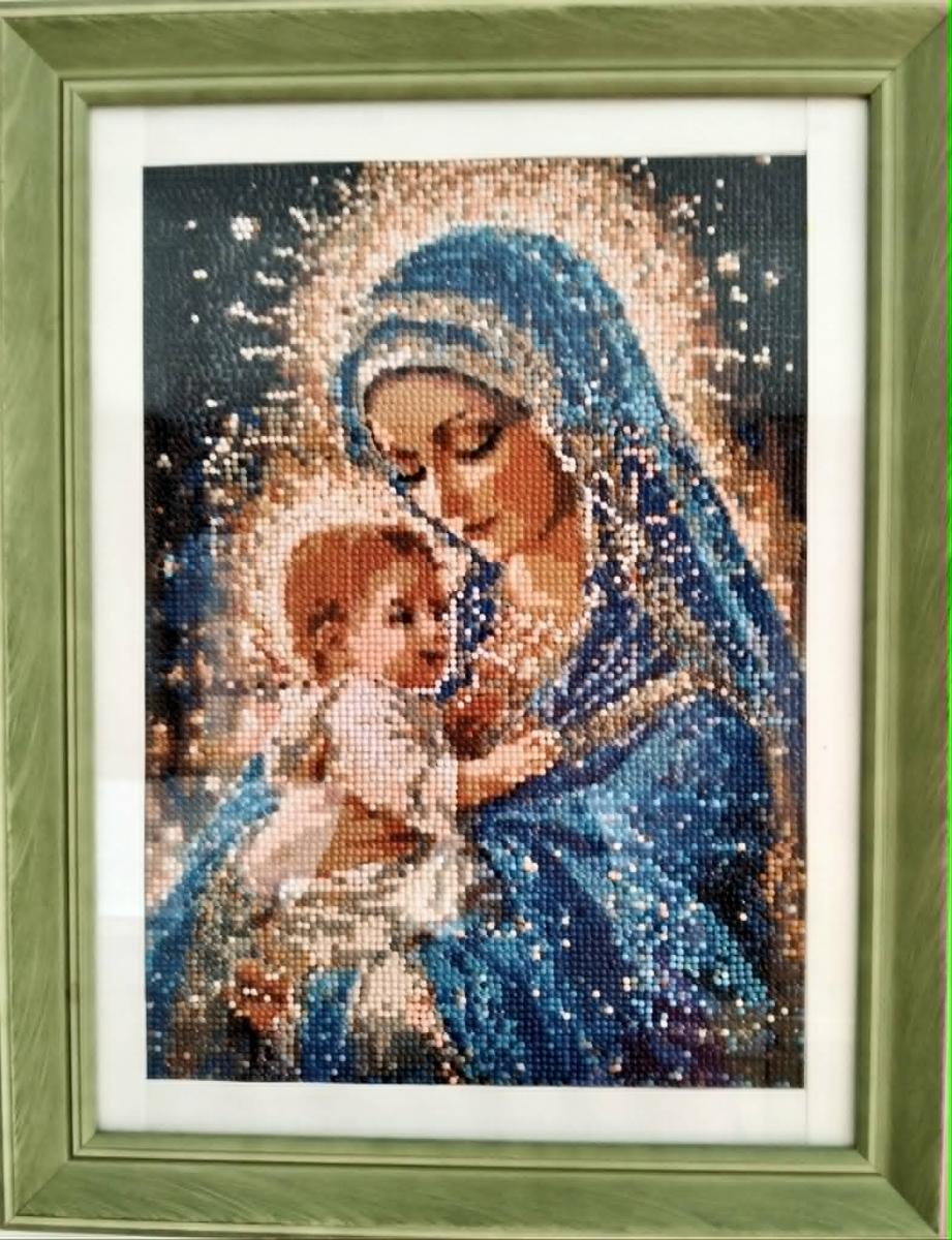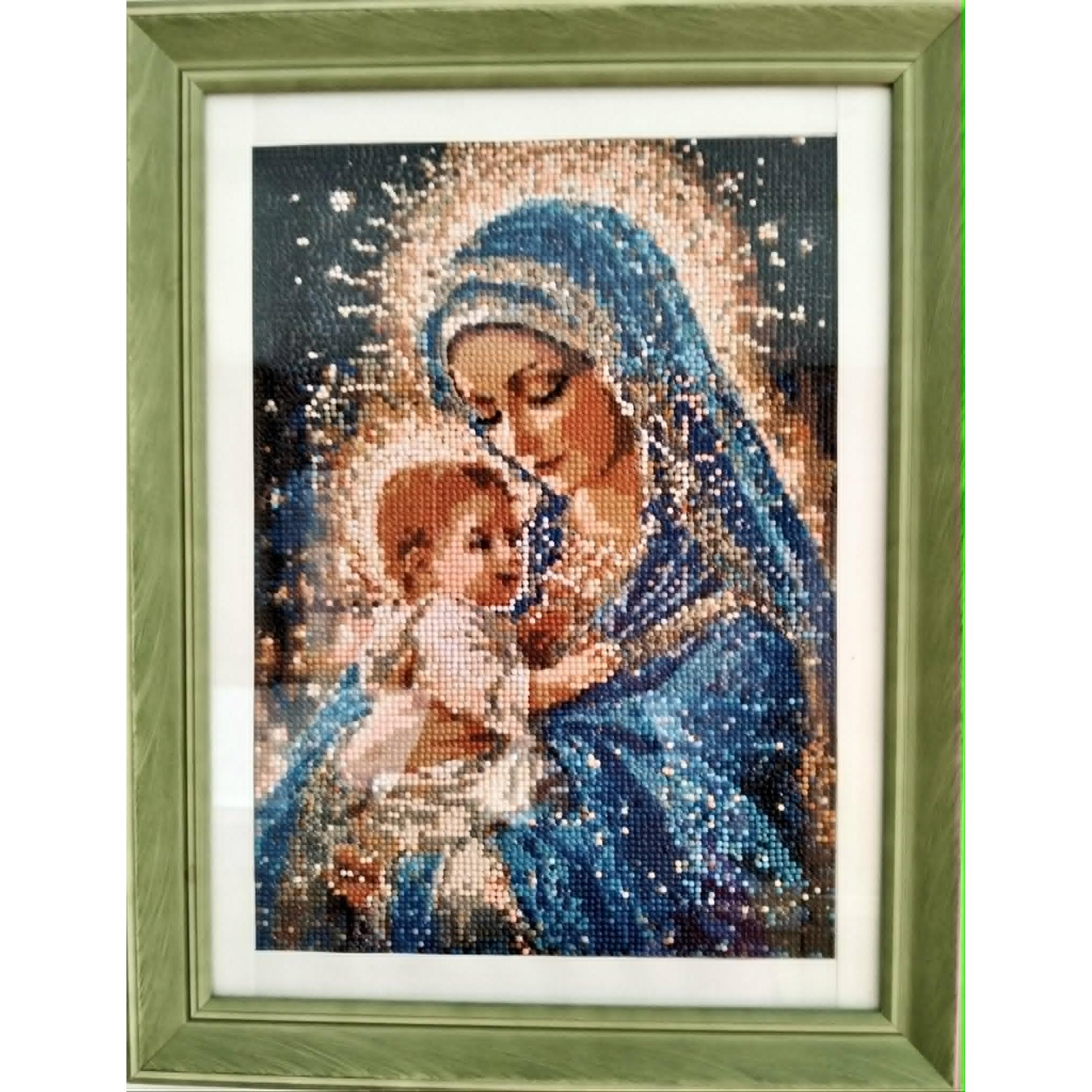 Il quadro presenta un effetto 3D e una trama piacevole al tatto. Giochi di luce: il vetro delle perline crea riflessi unici che cambiano a seconda dell'illuminazione nella stanza. Gamma cromatica: le intense sfumature colorate della veste della Madonna simboleggiano la purezza, mentre i toni dorati e beige delle aureole conferiscono maestosità all'immagine.la lavorazione accurata dei volti e delle mani trasmette tenerezza, serenità e amore materno.Impegno lavorativo 48 ore.