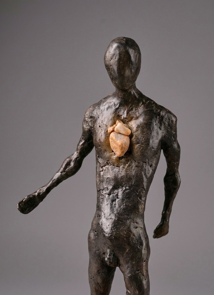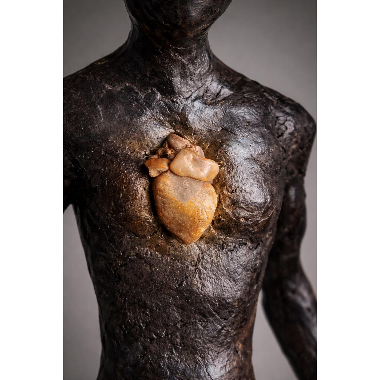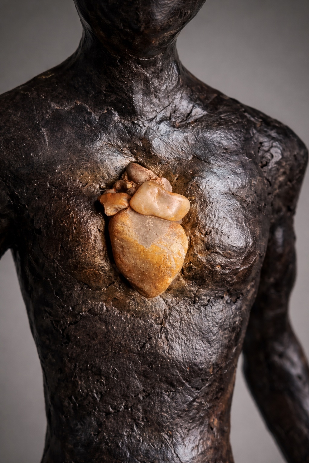 Durante una passeggiata a Porto Selvaggio ho trovato una piccola pietra a forma di cuore. Non il cuore simbolico a cui siamo abituati, ma quello anatomico, il nostro muscolo più vitale.Da lì è nata quest’opera: un cuore di pietra al centro di un’ombra nera, immobile.Una figura che rappresenta l’essere umano di oggi: in movimento, ma distante dalle emozioni, anestetizzato, alienato dai propri sentimenti. In un tempo segnato da tensioni geopolitiche e decisioni prese lontano dalla vita delle persone, l’individuo sembra sempre più spettatore inerme, trascinato da dinamiche più grandi di lui.Così quel cuore di pietra diventa il simbolo di un’umanità che continua a muoversi, ma che rischia di dimenticare cosa significhi davvero sentire.