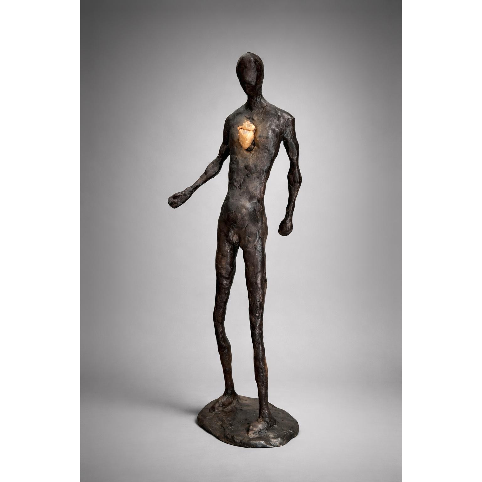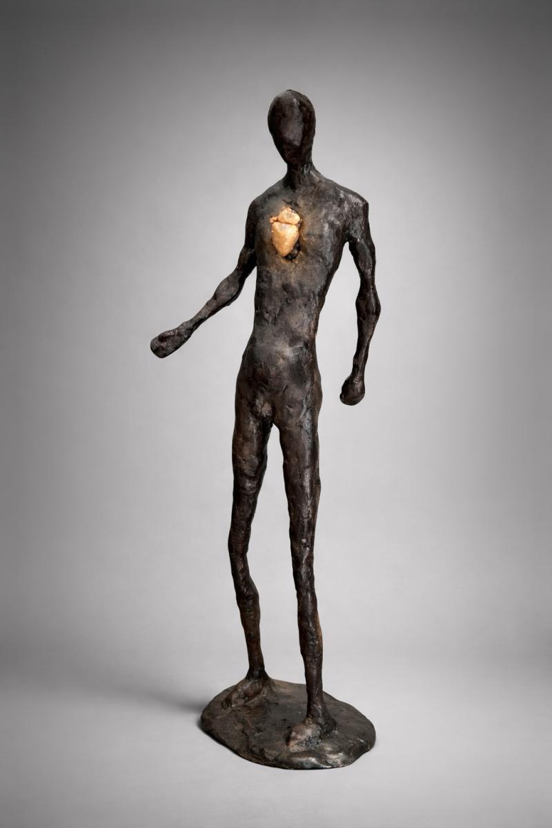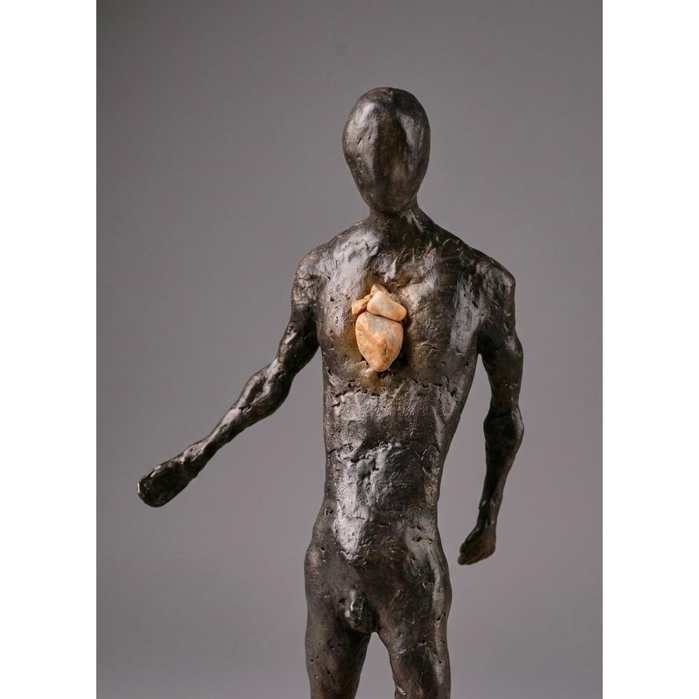 Durante una passeggiata a Porto Selvaggio ho trovato una piccola pietra a forma di cuore. Non il cuore simbolico a cui siamo abituati, ma quello anatomico, il nostro muscolo più vitale.Da lì è nata quest’opera: un cuore di pietra al centro di un’ombra nera, immobile.Una figura che rappresenta l’essere umano di oggi: in movimento, ma distante dalle emozioni, anestetizzato, alienato dai propri sentimenti. In un tempo segnato da tensioni geopolitiche e decisioni prese lontano dalla vita delle persone, l’individuo sembra sempre più spettatore inerme, trascinato da dinamiche più grandi di lui.Così quel cuore di pietra diventa il simbolo di un’umanità che continua a muoversi, ma che rischia di dimenticare cosa significhi davvero sentire.
