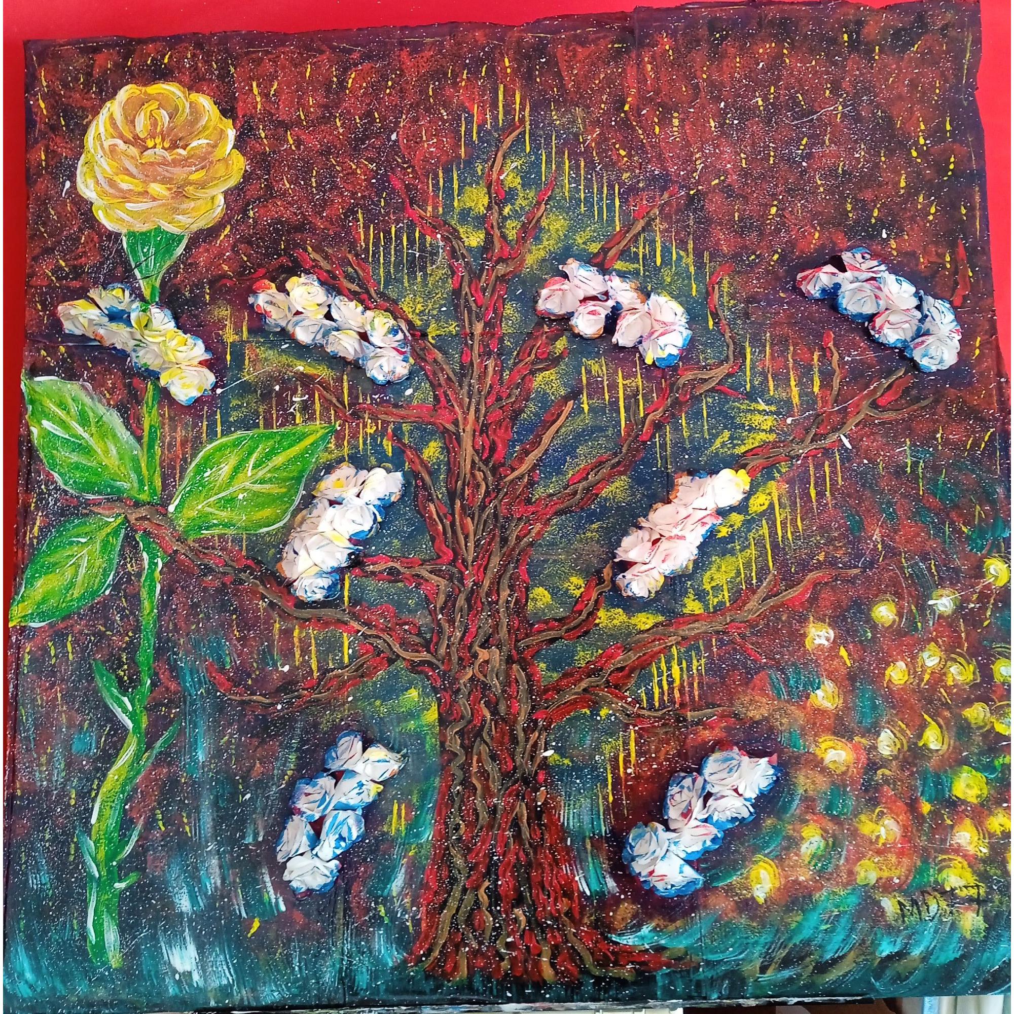 > Colla vinilica e colore hanno dato forma alle venature dell’albero, creando rilievi materici che catturano la luce e amplificano la forza visiva della composizione. > > La texture nasce dal gesto, si solidifica nel tempo e diventa parte integrante della struttura del dipinto. > > Ogni strato aggiunge profondità, ogni venatura racconta un movimento.
