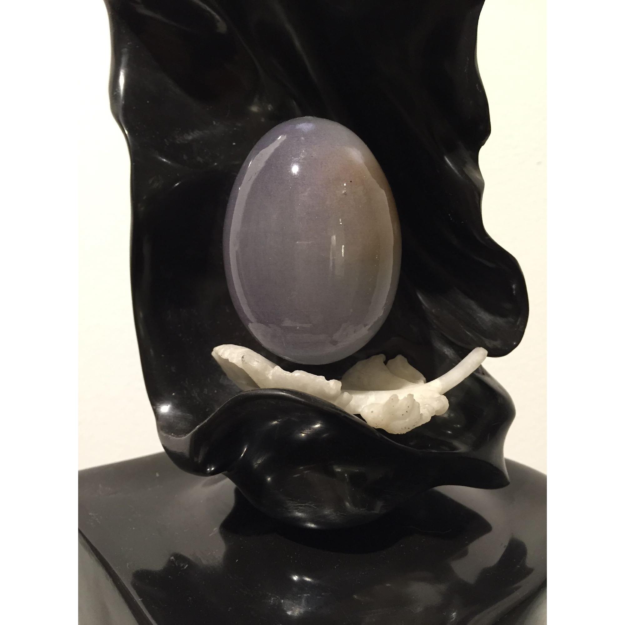 Scultura in marmo – opera unica Opera unica realizzata in marmo Nero del Belgio e alabastro rosa. L’opera è simbolo e augurio di fertilità, l’uovo rappresenta la nascita, mentre la foglia, trae ispirazione dalle foglie autunnali del Lago di Como piegate dal vento, rappresenta il ciclo della vita, la fine prima della rinascita . Anche le forme morbide che ricordano le acque del lago, in un notturno, racchiudono simbologie legate alla vita e alla rinascita. Simbologie che portano buona auspicio. Interamente realizzata con pietre e marmi, autoctoni del Lago di Como. Materiali unici. Opera contemporanea ma dal sapore di tradizione italiana .