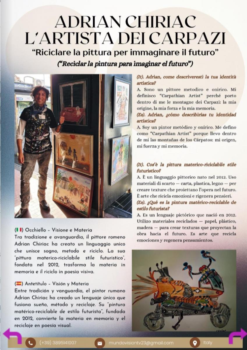 Adrian Chiriac (in arte Ady.Cc) è un artista contemporaneo noto per il suo stile personale definito come "pittura materica riciclabile stile futuristico". Caratteristiche dello stile:Materico e Riciclabile: L'artista utilizza materiali di riciclo nelle sue opere, integrando la creatività libera con la logica del riuso.Stile Futuristico: Le sue creazioni sono caratterizzate da un'estetica che l'artista stesso definisce futuristica, spesso con effetti tridimensionali.Tecnica Mista: Chiriac impiega tecniche miste e collage per dare forma alle sue visioni, combinando pittura e altri elementi. Di nazionalità est-europea, Chiriac vive e lavora a Roma, dove ha esposto le sue opere in diverse mostre personali e collettive. È stato anche insignito del "Premio Mercurio d'Oro per le Arti Visive" per una delle sue opere.