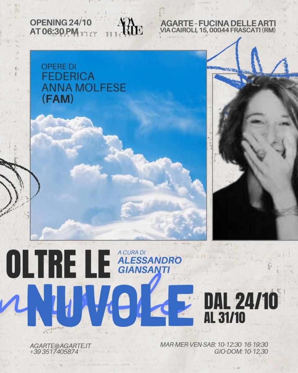 “Oltrele nuvole”propone una raccoltadi opere realizzate durantegli annidall’artistaFedericaAnna Molfese (FAM),creativapoliedrica con focus pittorico, scultoreo e fotografico.l’opera artisticadi FAMsidistingue per lapotente narrazione autobiografica che ne compone lavasta produzione.