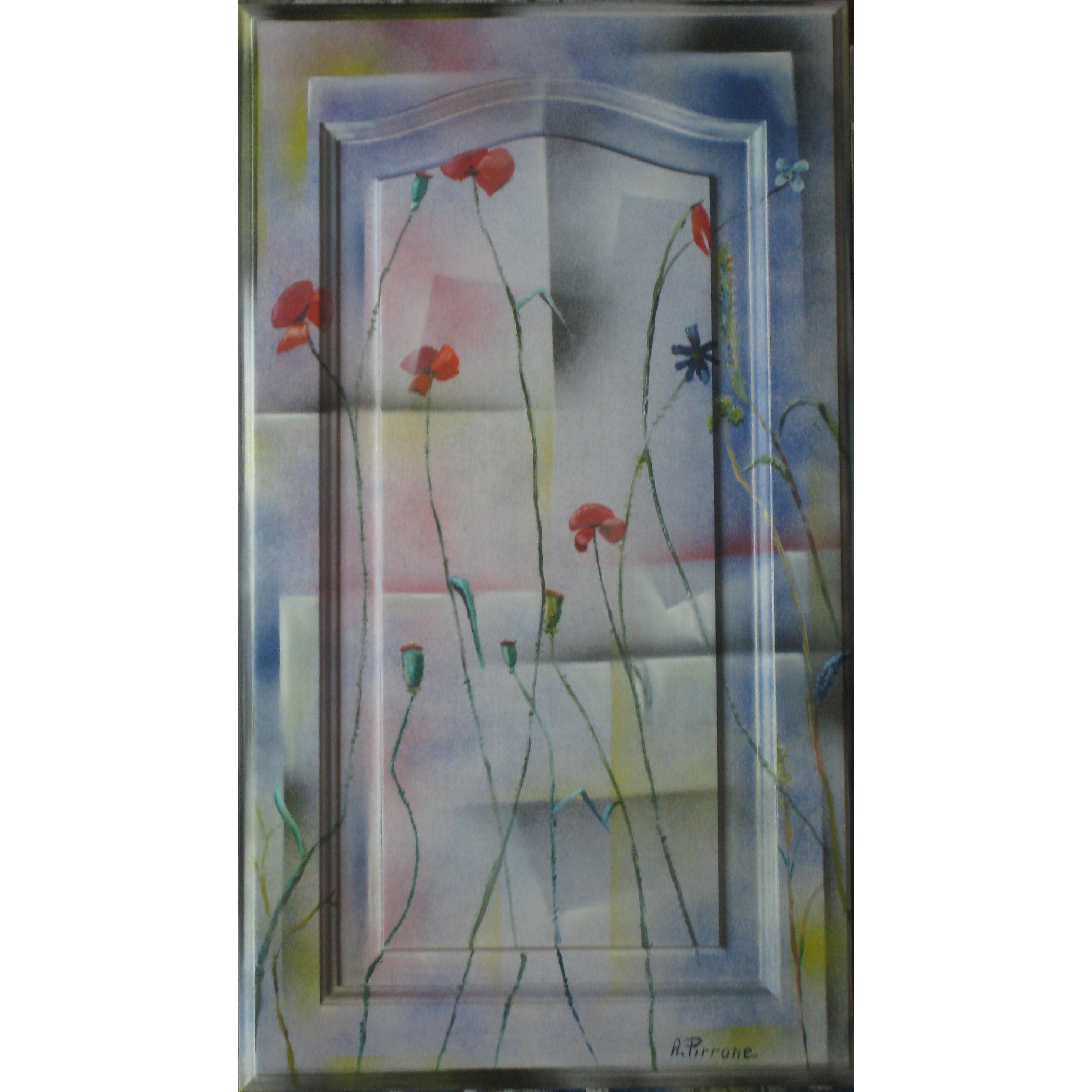 Opera eseguita su sportello pensile anni 70 in legno di ciliegio.