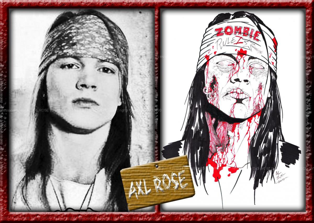 Ritratto in versione fumetto/zombie di Axl Rose, leader dei Guns'n'Roses, incorniciato virtualmente e accostato alla foto di riferimento.
