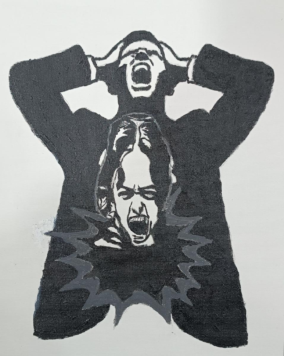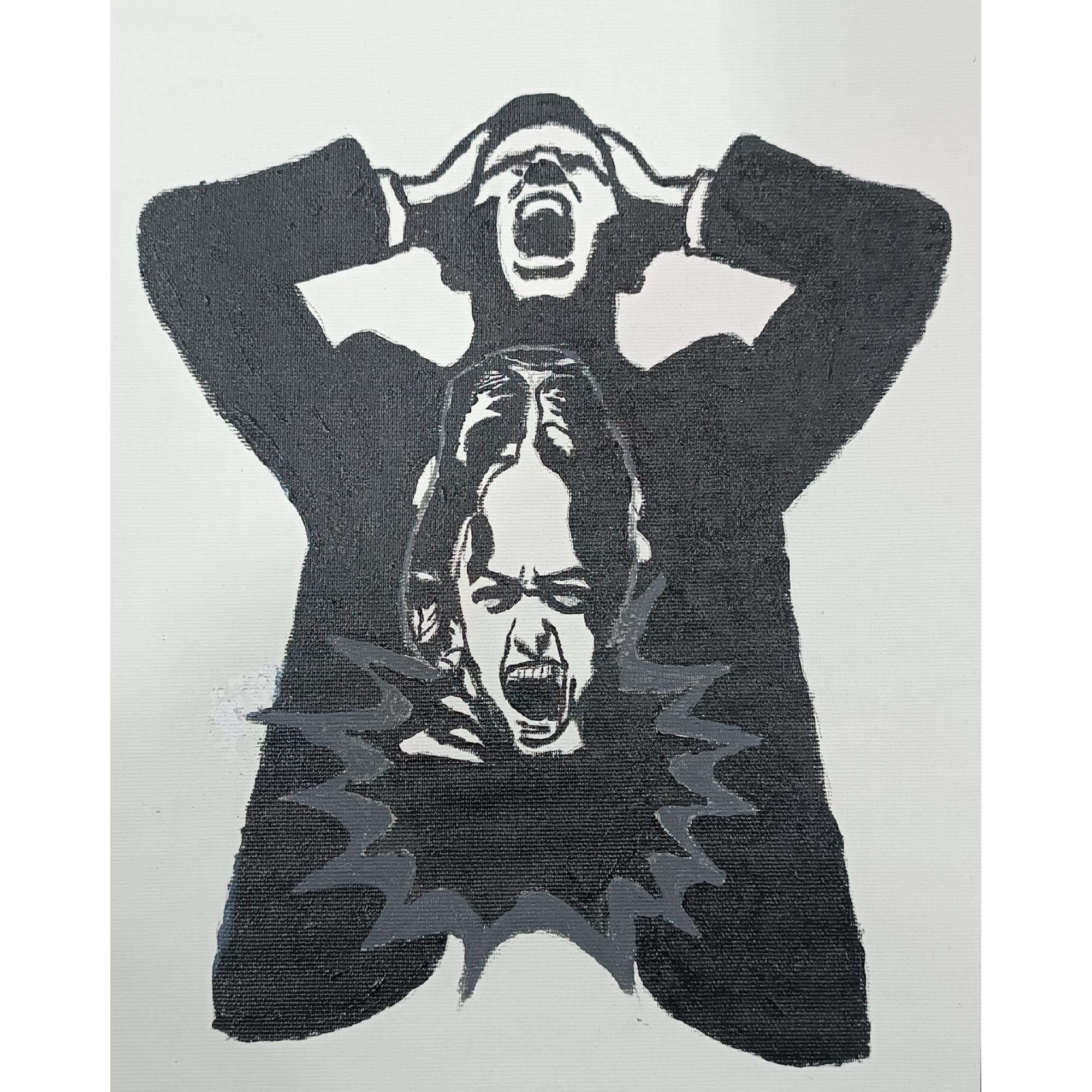 Soggetto e tema: Il dipinto raffigura una figura umana con le mani che le coprono le orecchie, che urla con disperazione. All'interno della sagoma, nel petto, c'è il volto urlante di una seconda persona. Questa sovrapposizione di figure suggerisce un conflitto interiore o la manifestazione di un'altra personalità.Stile: Lo stile è tipico della street art, in particolare dello stencil, reso popolare da artisti come Banksy. È uno stile diretto, visivamente potente e spesso usato per veicolare messaggi politici o sociali.Tecnica: L'uso del bianco e nero crea un forte contrasto. La silhouette esterna e la figura interna, pur essendo composte dallo stesso colore, sono ben distinte grazie alla sovrapposizione e al "ritaglio" della sagoma. La parte in basso che ricorda un'esplosione, di un grigio più chiaro, aggiunge ulteriore dinamismo all'opera.Significato: Il titolo "L'Altro" suggerisce una dualità. La figura principale è in preda all'angoscia a causa della figura "dentro", che potrebbe simboleggiare un'emozione repressa, un'altra personalità o un'idea che è in conflitto con la persona.