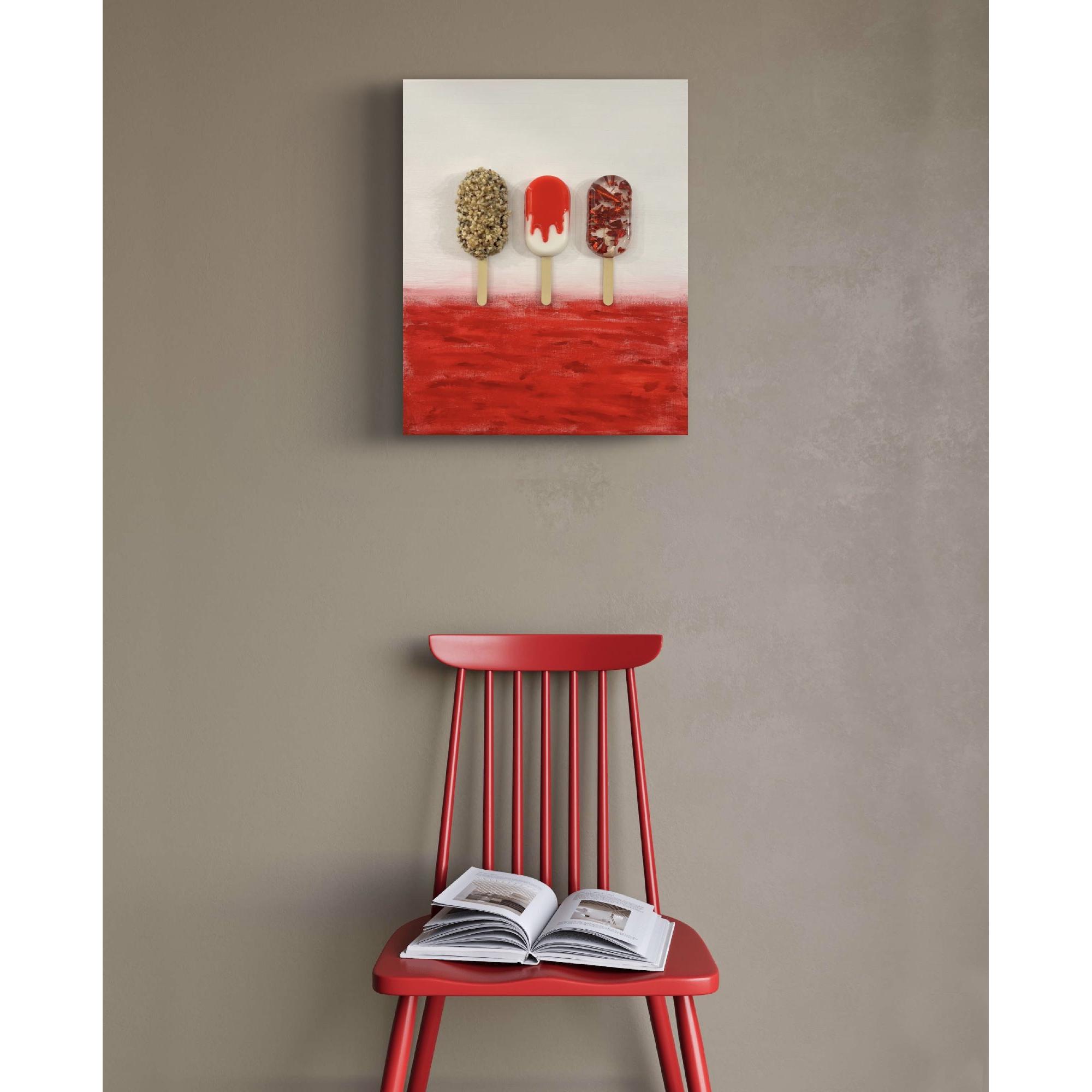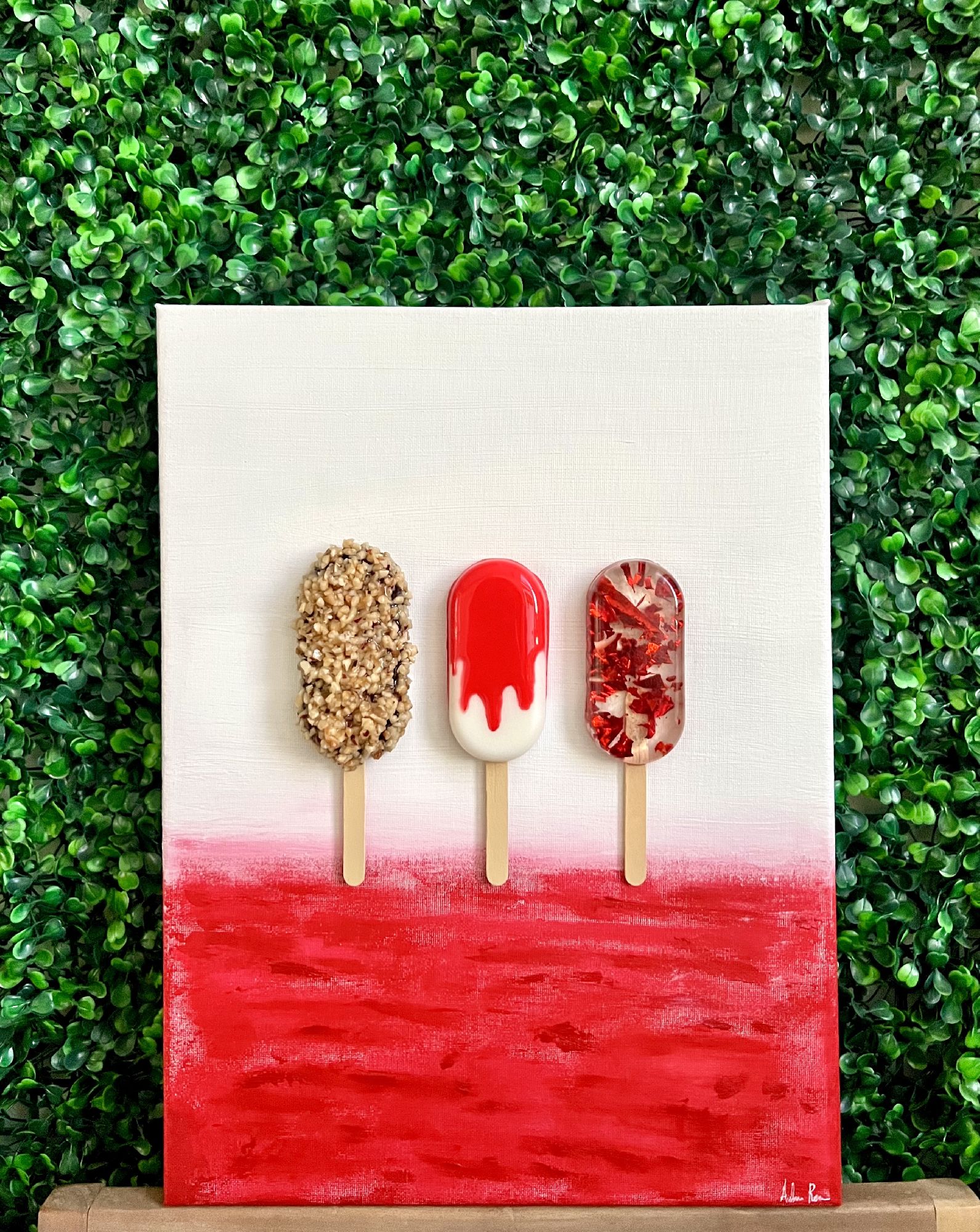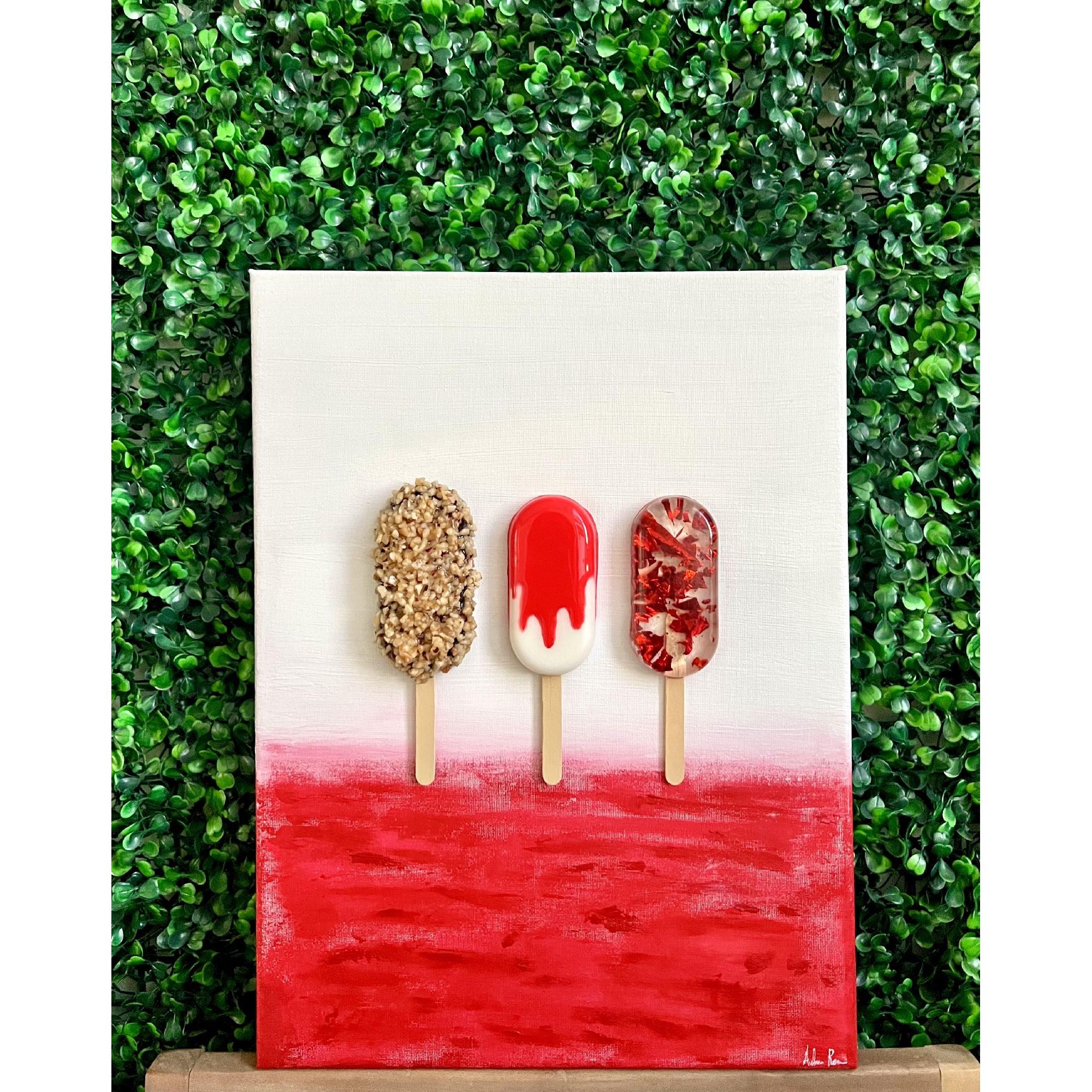 Questa mia opera si sviluppa su una tela dominata da pennellate di un rosso profondo e vibrante, simbolo di passione e intensità. Al centro della composizione emergono gelati in resina, realizzati con dettagli meticolosi, ricoperti da foglie rosse lucenti e decorati con piccole noccioline che donano tridimensionalità e una sensazione tattile.