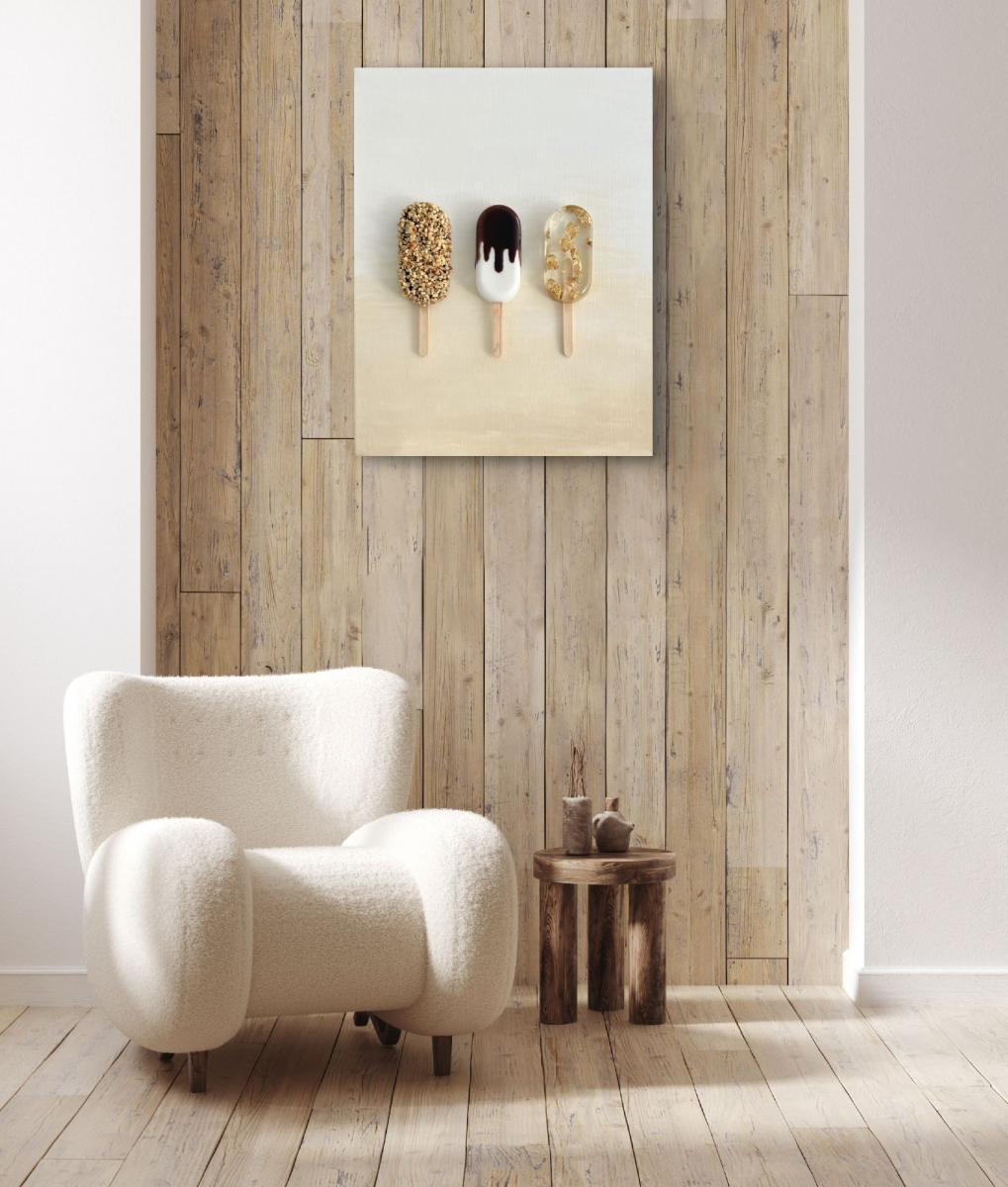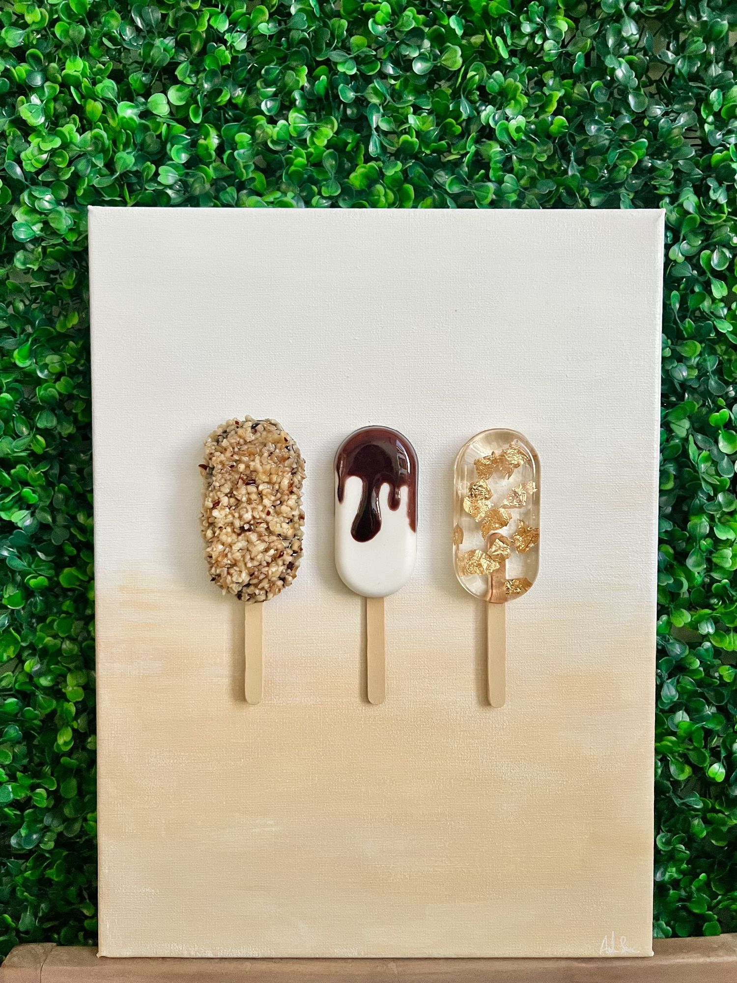 L’opera unisce gelati in resina tridimensionale su tela, decorati con foglia d’oro e noccioline, creando un contrasto tra l’effimero e il prezioso. Le noccioline, semplici ma raffinate, aggiungono una dimensione tattile, trasformando l’opera in una riflessione sulla bellezza nascosta nei dettagli quotidiani.