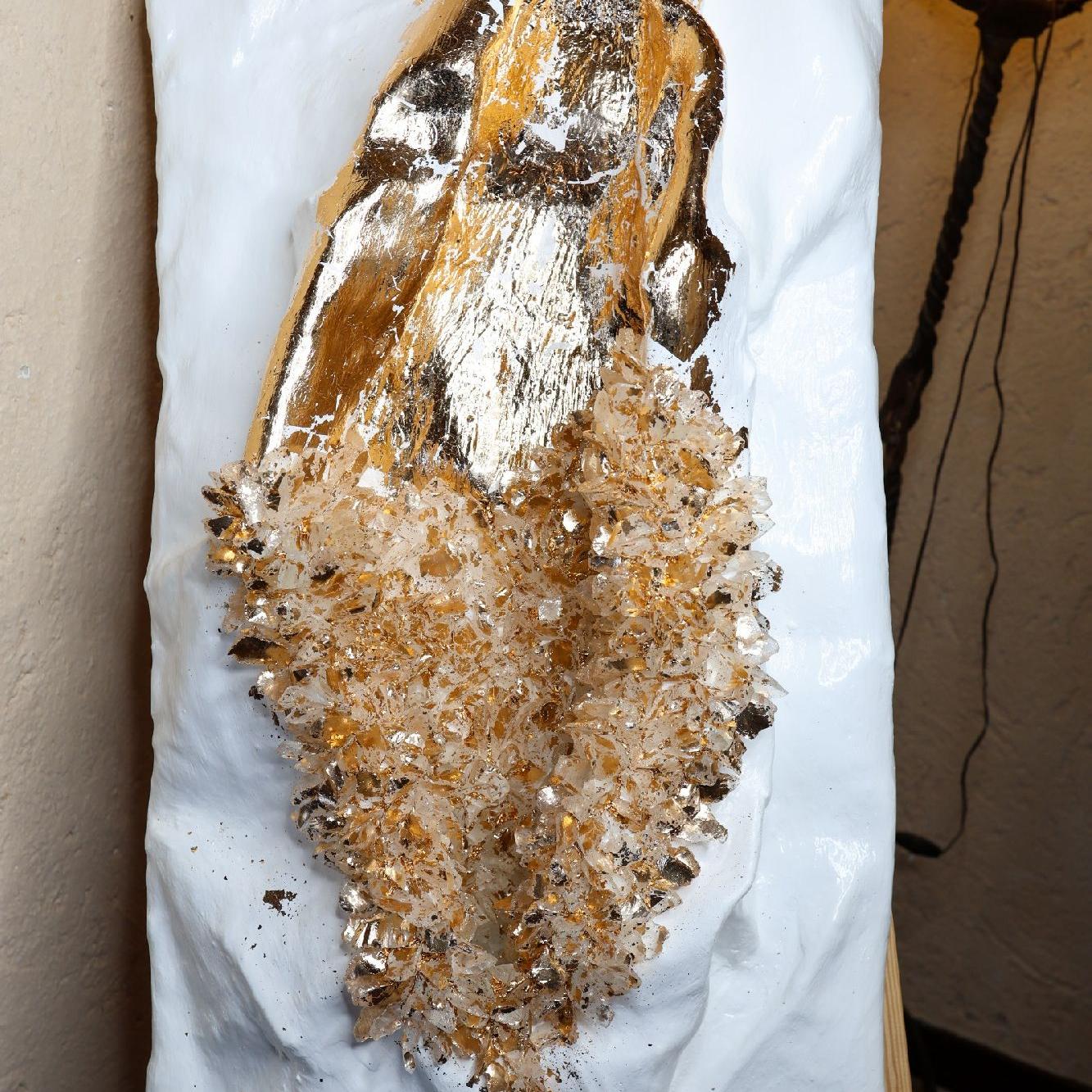 Tesoro – Scultura da Parete in Cemento Bianco, Oro 24K e Cristalli