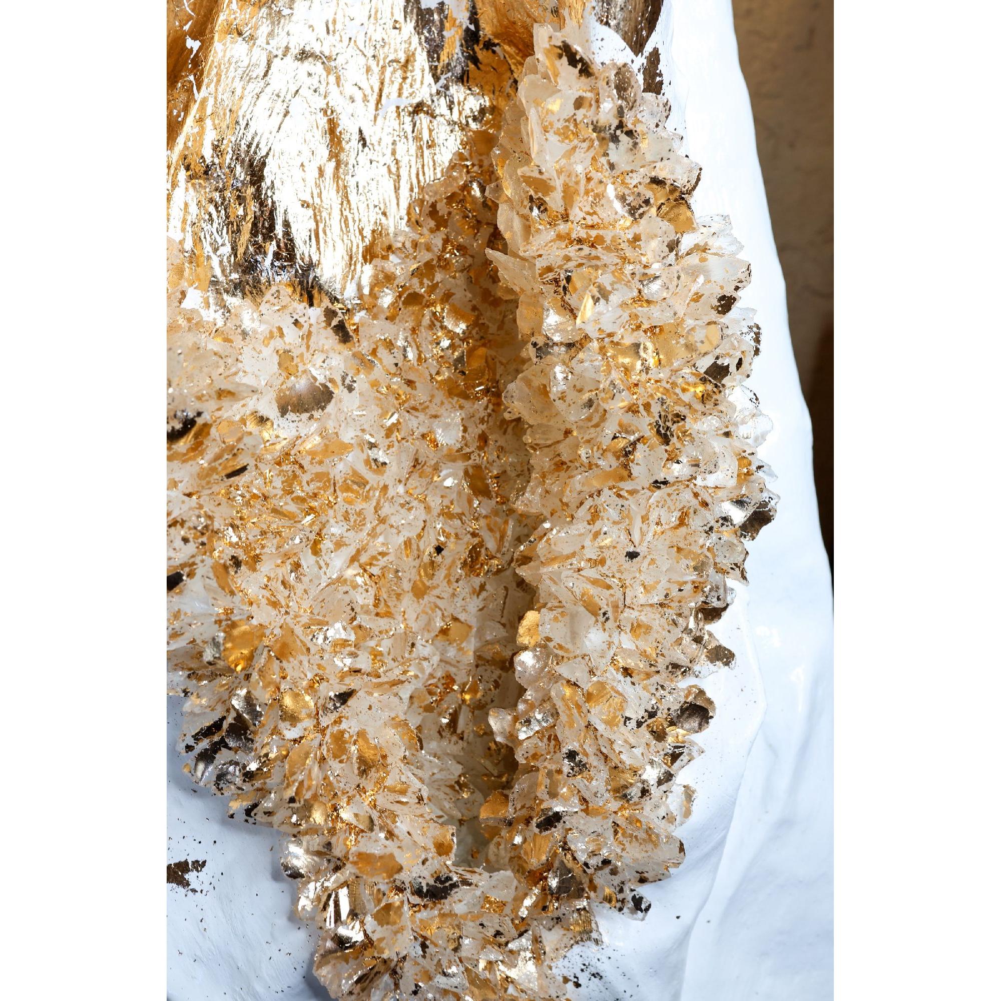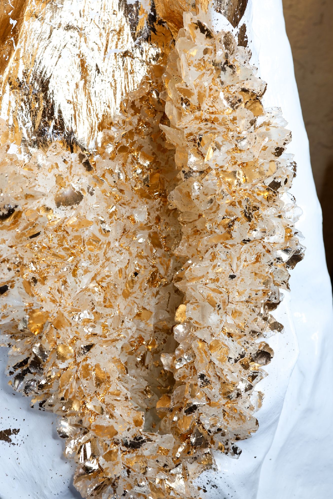La superficie in cemento bianco crea una base pura e silenziosa, quasi glaciale, sulla quale l’oro 24K esplode con calore e potenza. I cristalli emergono come una geode preziosa, un nucleo luminoso che sembra nascere dall’interno della materia. L’effetto è quello di un tesoro che affiora, custodito nella roccia, rivelando la ricchezza nascosta sotto la superficie.