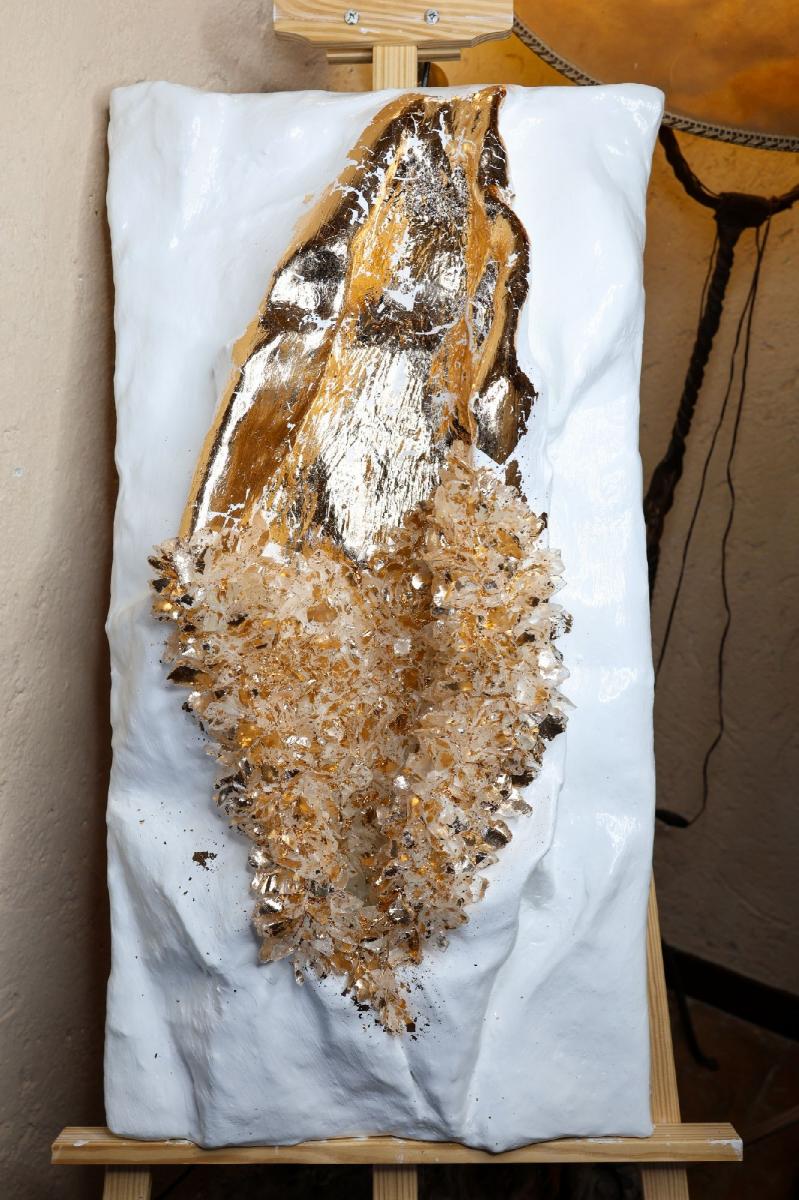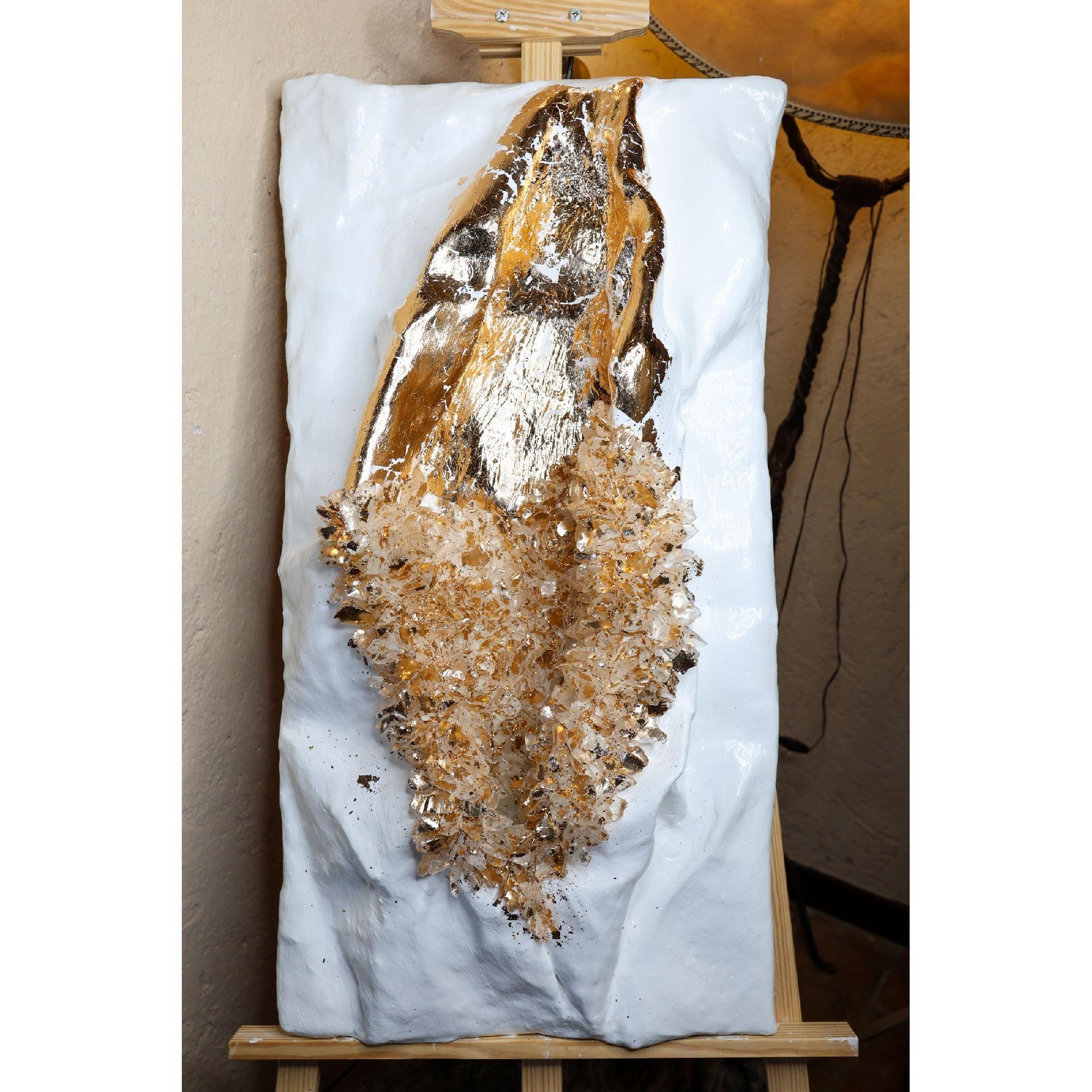 Tesoro – Scultura da Parete in Cemento Bianco, Oro 24K e Cristalli