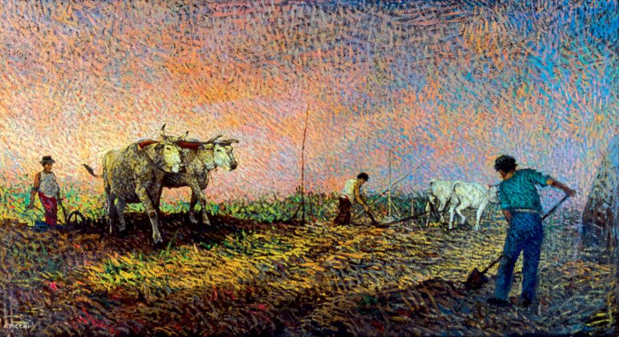 Bellissima scena della campagna toscana. Eseguita dal vero. Risalta la maestosità della coppia di buoi, procedenti dal fondo verso il primo piano, con movimento solenne e misurato che confersice operosa serenità a tutta la scena, in un rapporto primigenio tra i caldi colori della trerra e le cangianti frastagliature del cielo...
