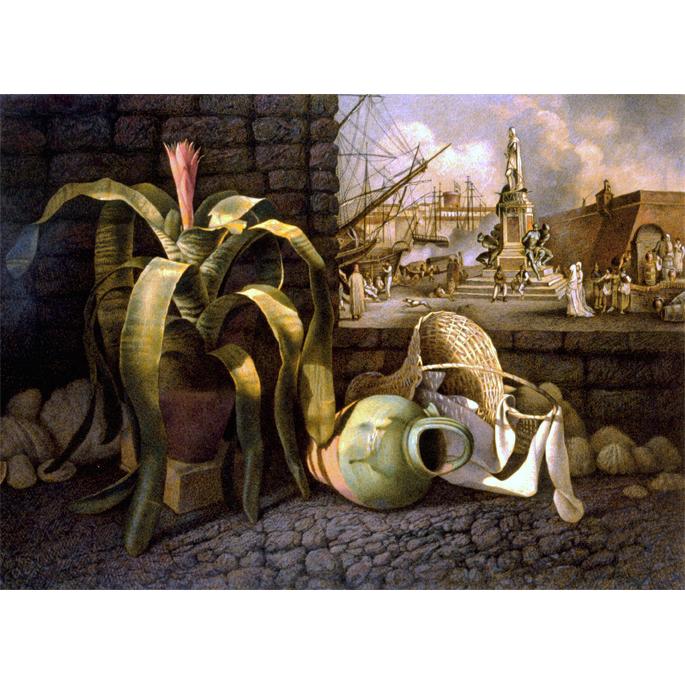 Una ricostruzione fantastica della piazza dei Quattro Mori e della Fortezza Vecchia a livorno, ripresa da una stampa dell'epoca, come rivista da una finestra d'un ipotetico balcone. Uno sguardo sulla vita dei secoli scorsi, riproposto con intelligente e fresca invenzione fantastica. Si notino, nel fondo dei primi piani, in basso, le forme di conchiglie fossili, quasi a ricordare l'insignificanza di un momento di vita, ancora a noi vicino, ma già inghiottito dagli abissi del tempo.