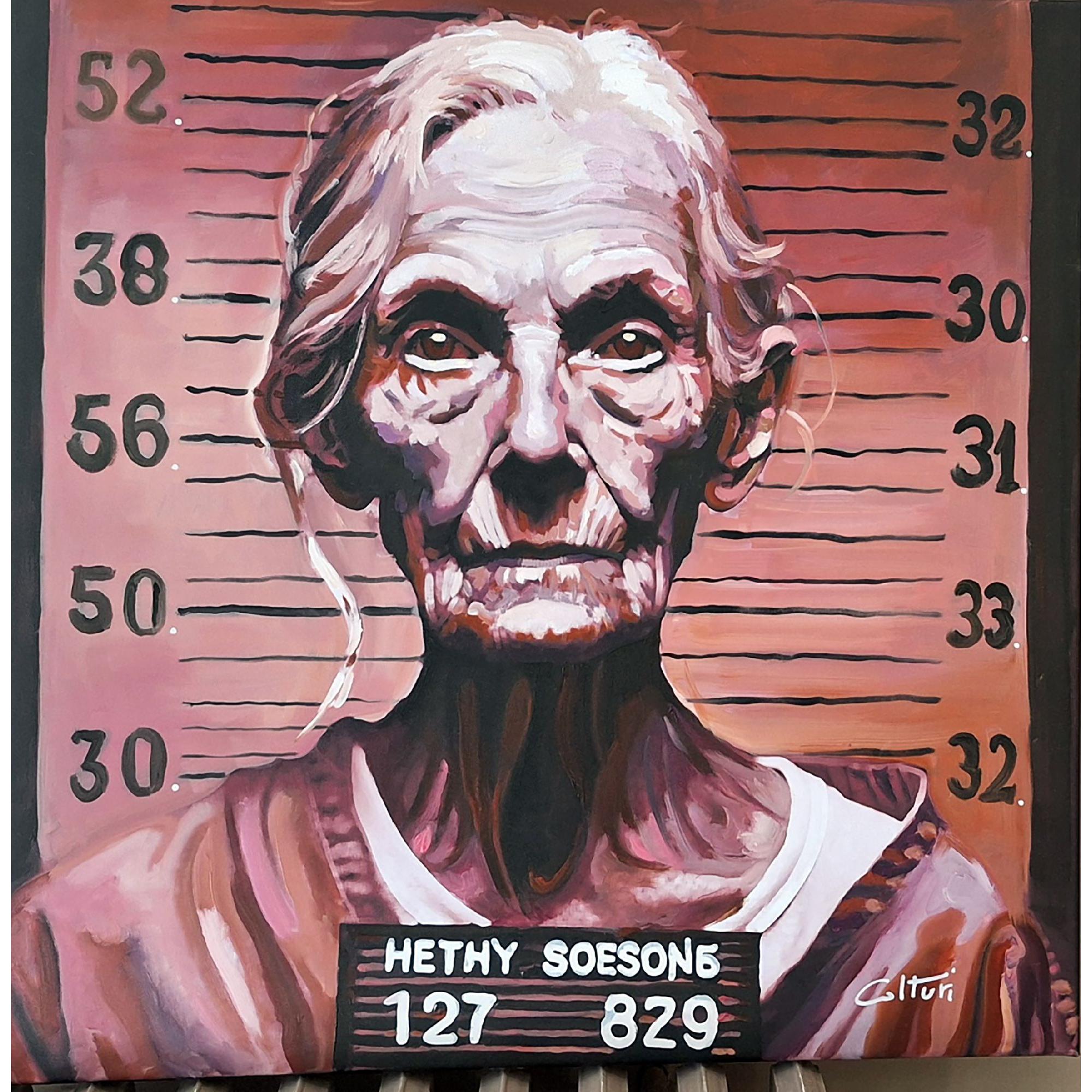 Il volto di una donna anziana, scavato dal tempo, si staglia al centro di un'inquadratura da foto segnaletica, carica di tensione e silenzio. Lo sguardo è fermo, quasi ieratico, eppure inquietante. La delicatezza dell’età avanzata contrasta con l’immaginario del serial killer evocato dalla scena, suggerendo una narrativa disturbante ma sottilmente affascinante.