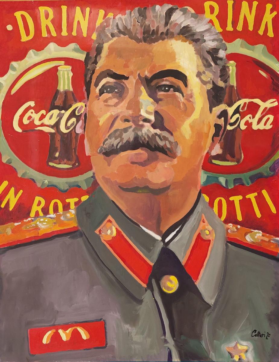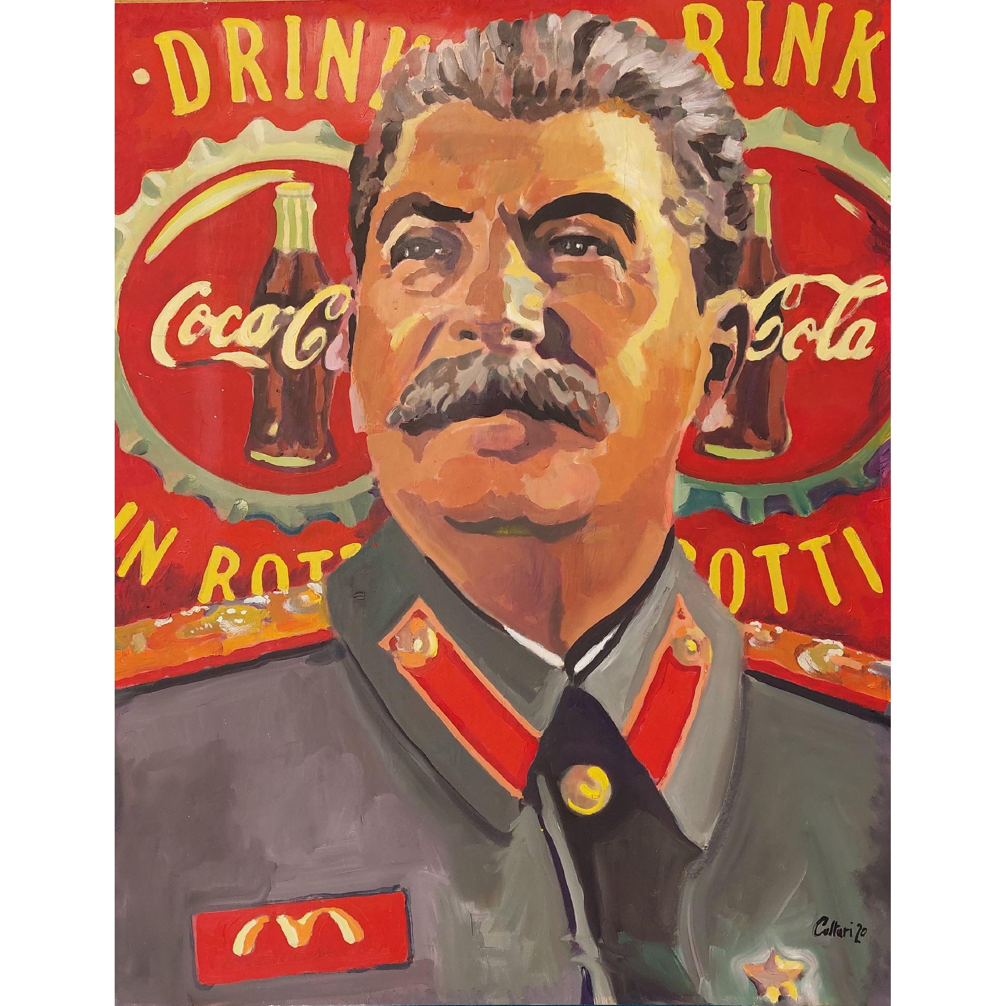 In questa composizione ironica e dissacrante, la figura iconica e autoritaria di Stalin viene immersa in un universo visivo dominato dai simboli del capitalismo globale: Coca-Cola, McDonald’s, colori pop e grafica pubblicitaria. L'opera gioca abilmente sul contrasto tra ideologie opposte — comunismo e consumismo — fondendole in un’unica immagine paradossale.