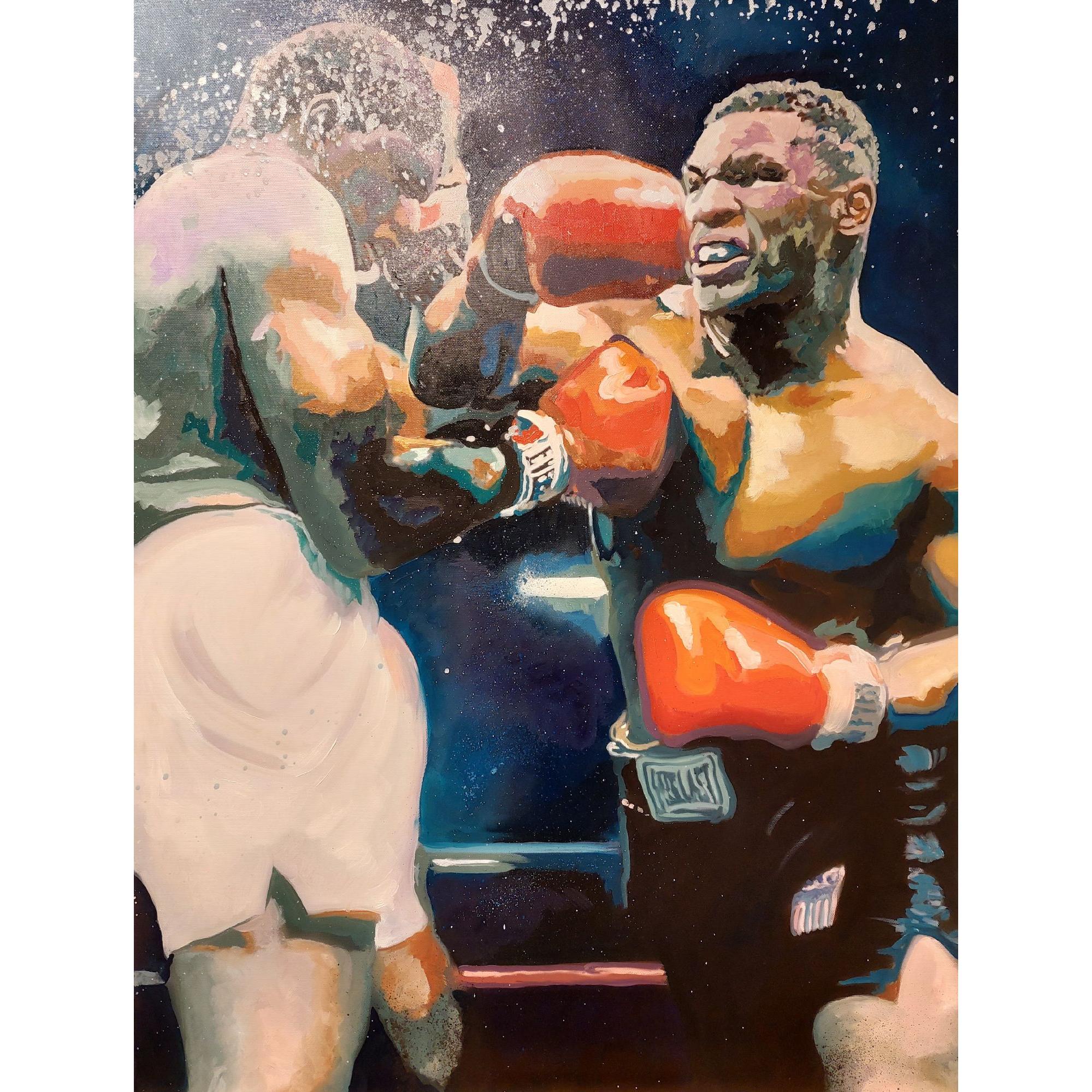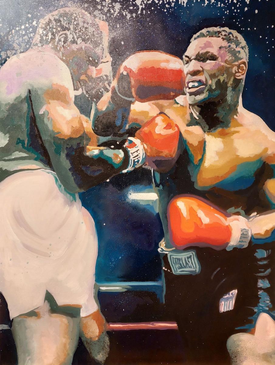 Questo quadro rappresenta una scena intensa e drammatica di un incontro di boxe, catturata con grande forza espressiva. ho scelto una composizione ravvicinata, focalizzandosùmi sul momento esatto in cui un pugile colpisce violentemente l’avversario, sprigionando sudore e tensione nell’aria. La pennellata è dinamica, quasi esplosiva, e i colori saturi — soprattutto il rosso acceso dei guantoni — accentuano l’impatto e la violenza dell’azione.