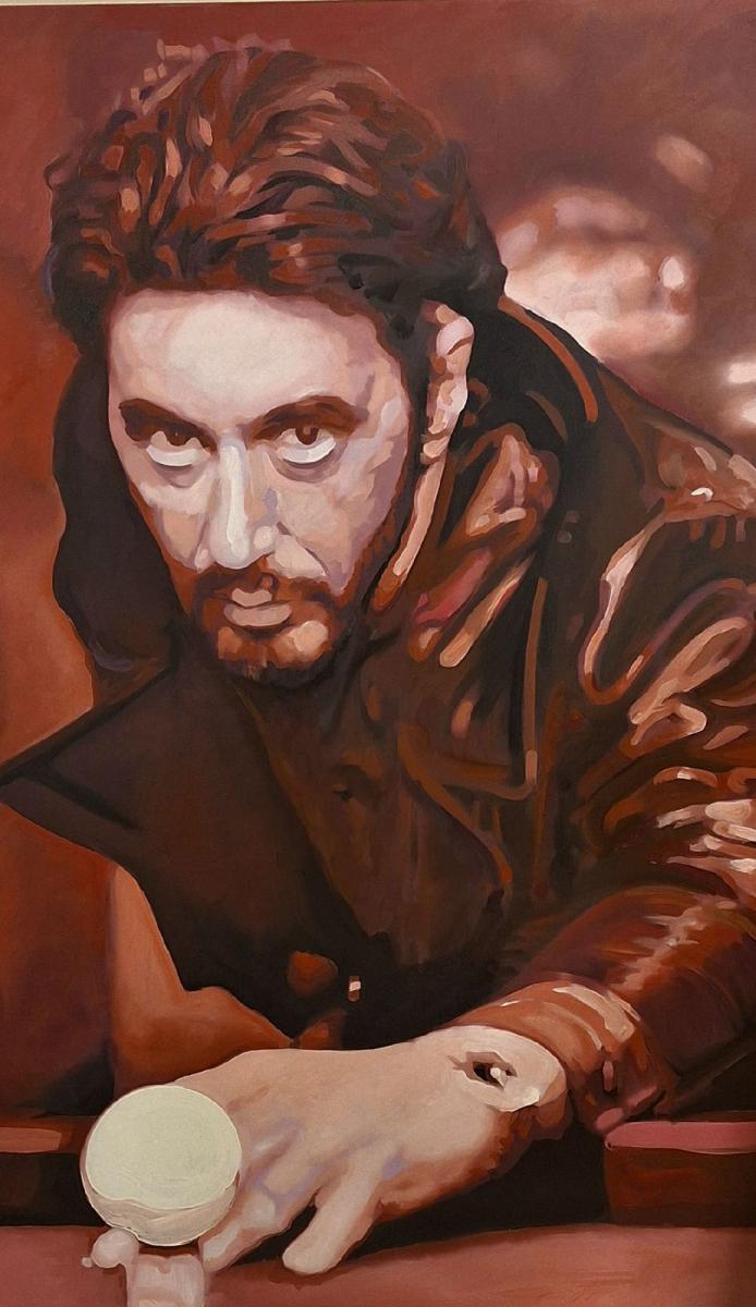 La scelta di ritrarre Al Pacino in una posa così carica di tensione narrativa sottolinea il legame tra cinema e pittura: l’opera va oltre il semplice ritratto per diventare racconto, atmosfera, suggestione. Un tributo visivo a una delle icone del cinema mondiale, colto in un momento di silenziosa intensità.