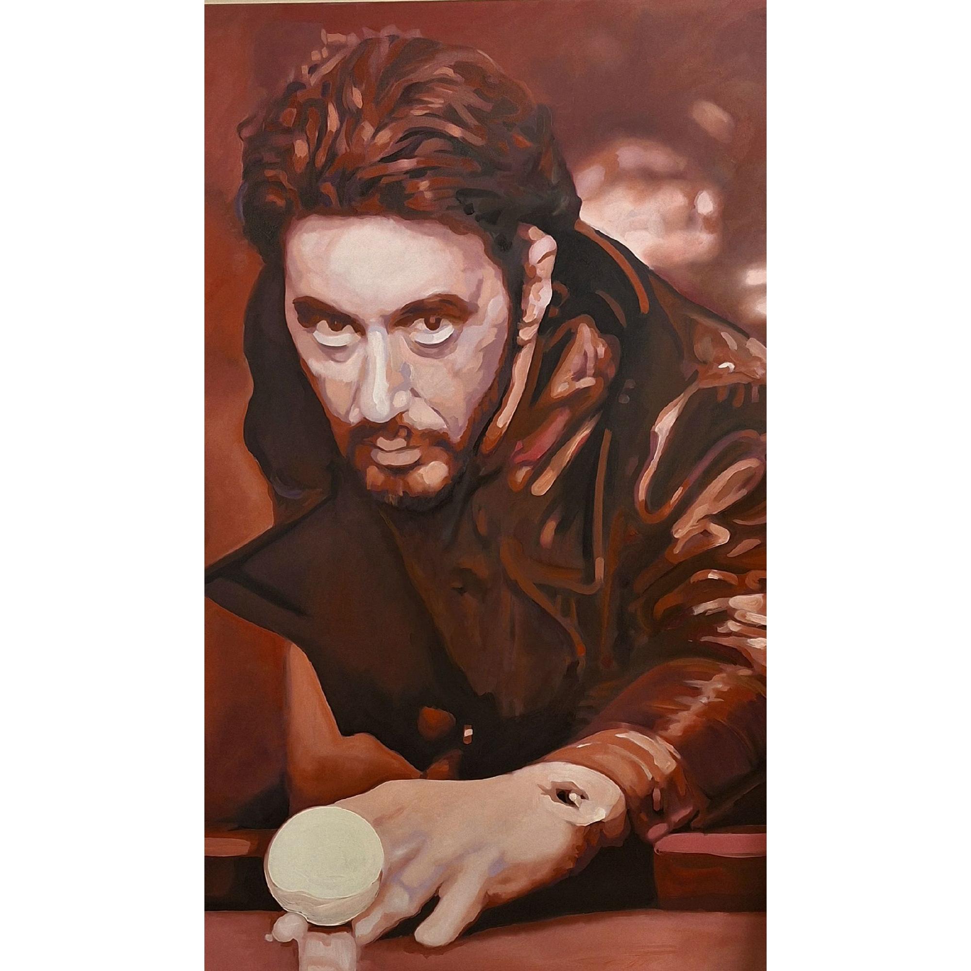 Questo quadro ritrae Al Pacino, colto in un momento di intensa concentrazione mentre sta per colpire una palla da biliardo. Il suo sguardo tagliente e penetrante, marchio di fabbrica dell’attore, è reso con grande efficacia dall’artista, che riesce a catturare tutta la forza espressiva del volto. La scena è avvolta in una tavolozza di toni caldi e terrosi — rossi, bruni, ocra — che donano all’opera una profondità emotiva intensa e quasi teatrale.