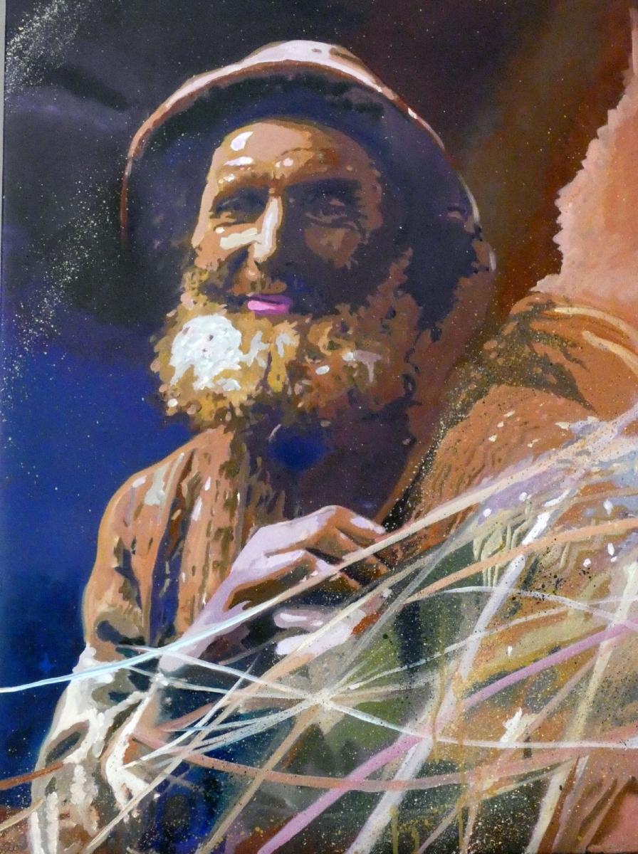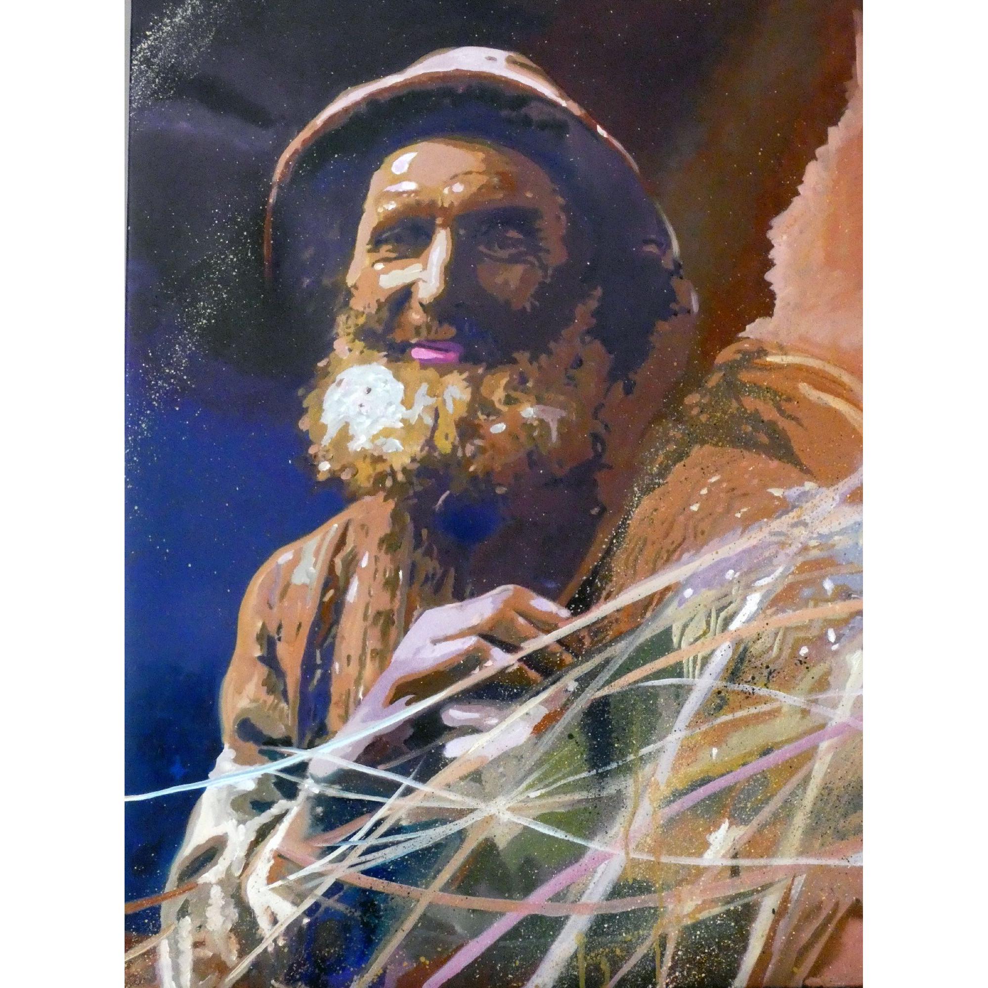 La resa pittorica è intensa, quasi teatrale, con un uso sapiente delle luci e delle ombre che scolpiscono il volto e le mani, mentre spruzzi e pennellate dinamiche avvolgono l’intera composizione, accentuando l’energia e il movimento. L’ambientazione cromatica si muove tra blu profondi e toni caldi della terra, creando un’atmosfera notturna, quasi magica.