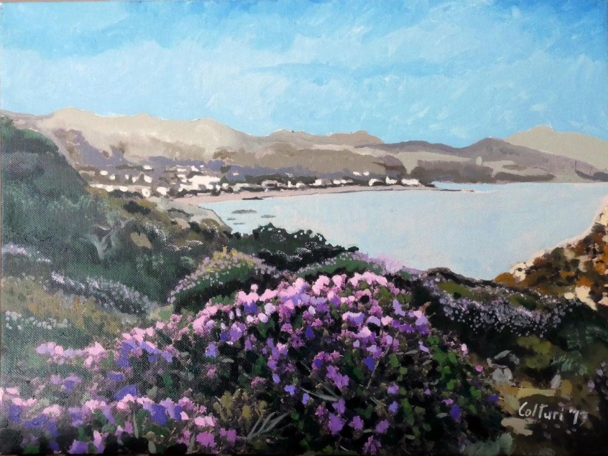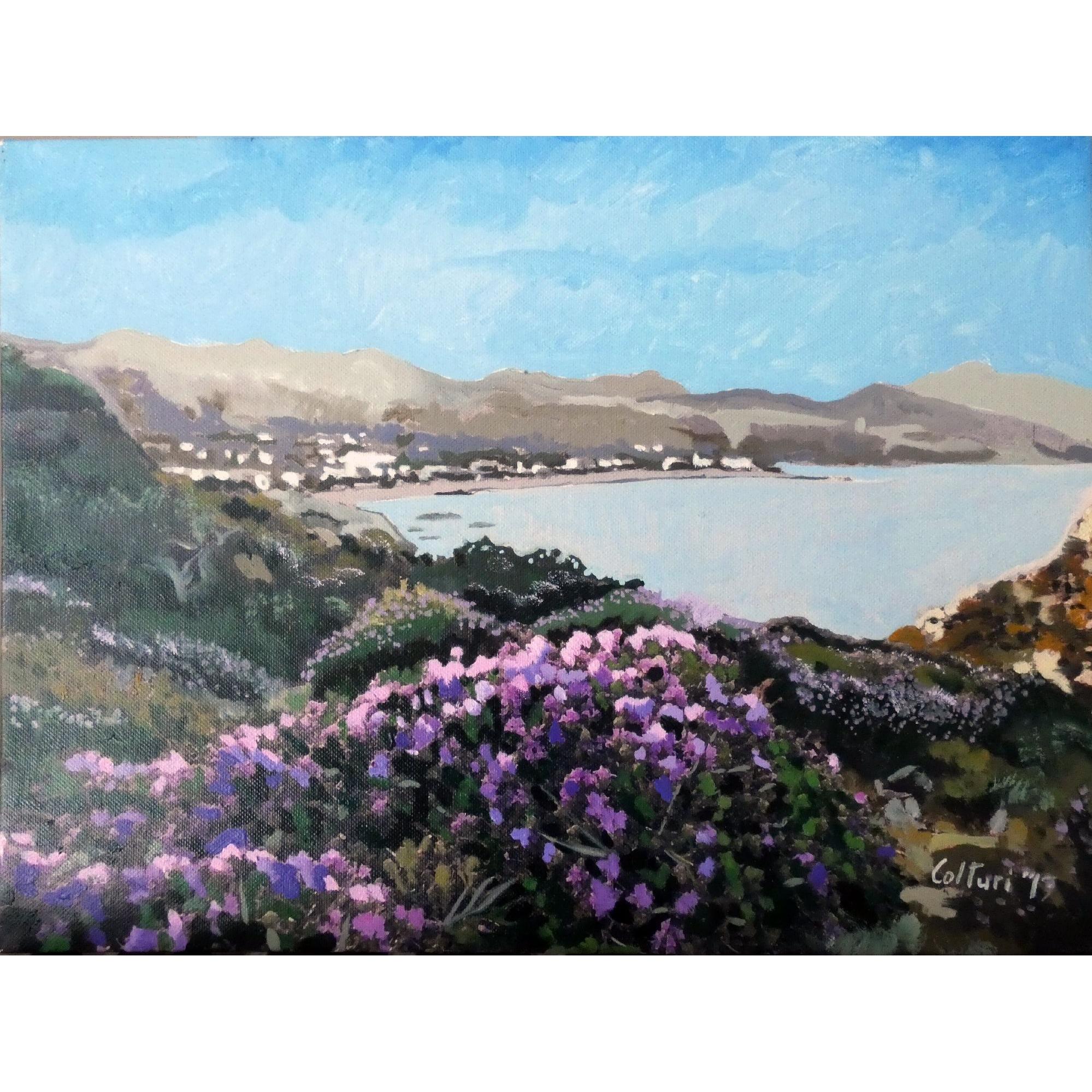 Questo piccolo quadro a olio, firmato "Colturi ‘97", è un’opera di collezione privata che ritrae con delicatezza e sensibilità un paesaggio delle isole greche. La scena si apre su una baia luminosa e tranquilla, vista dall’alto, con un’insenatura che abbraccia un villaggio costiero, sullo sfondo di morbide colline mediterranee. In primo piano, una fioritura rigogliosa di cespugli viola domina la composizione, introducendo l’occhio dello spettatore verso l’orizzonte marino.
