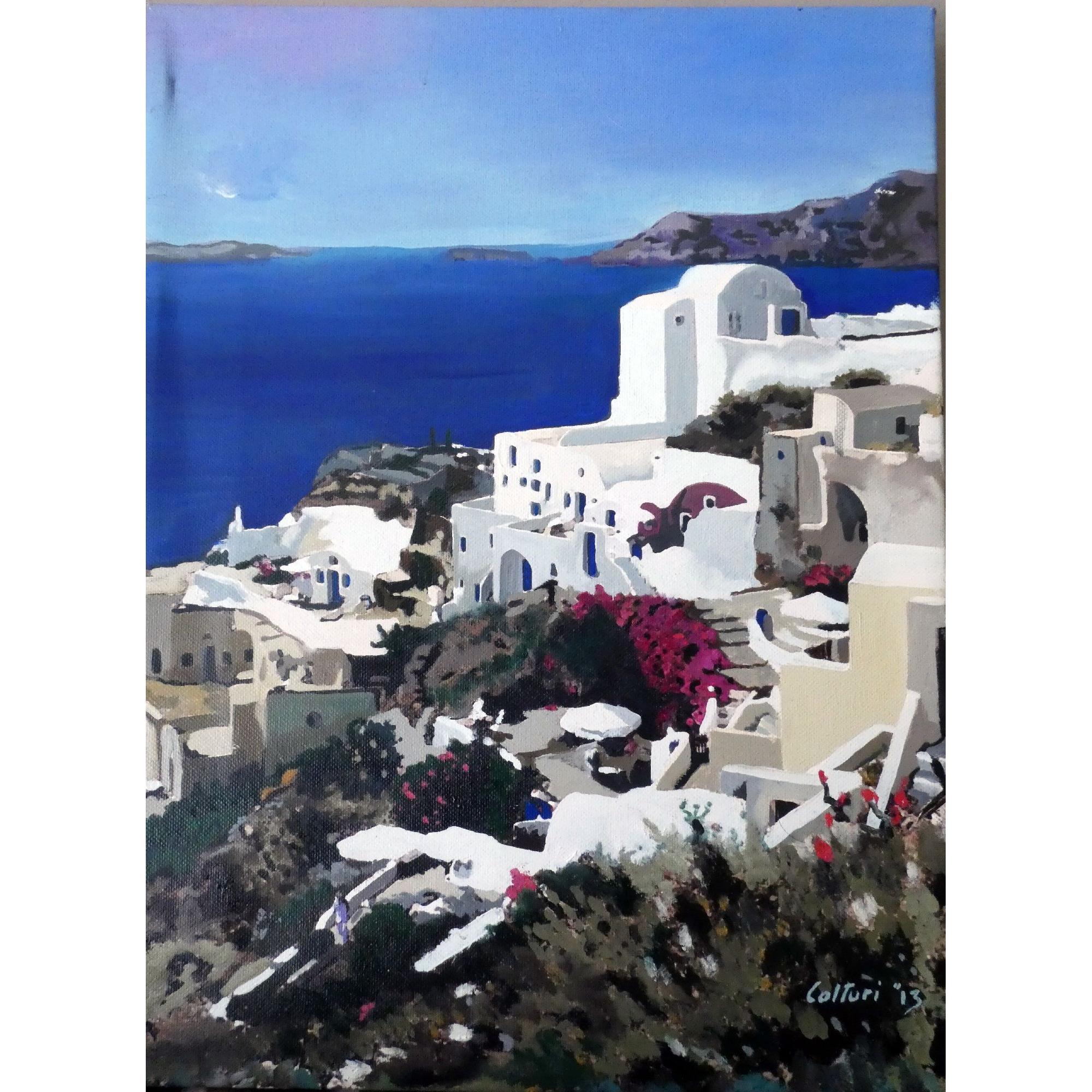 Questo piccolo quadro a olio, firmato Colturi ‘13 e parte di una collezione privata, raffigura con grande sensibilità uno scorcio delle isole greche, probabilmente Santorini, catturandone la luce, l’armonia architettonica e il fascino senza tempo. L’artista restituisce il candore abbagliante delle case bianche che si stagliano con eleganza contro l’intensità del mare Egeo e del cielo terso, in un contrasto cromatico di straordinaria efficacia.