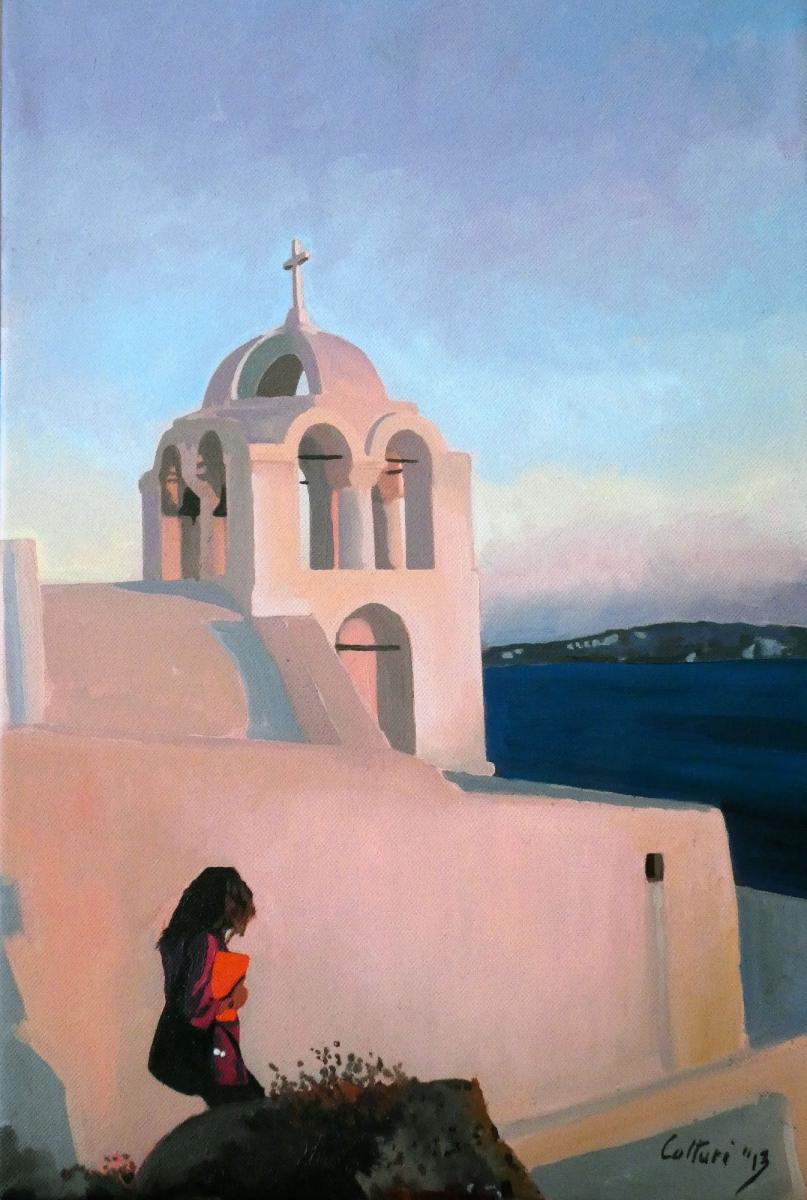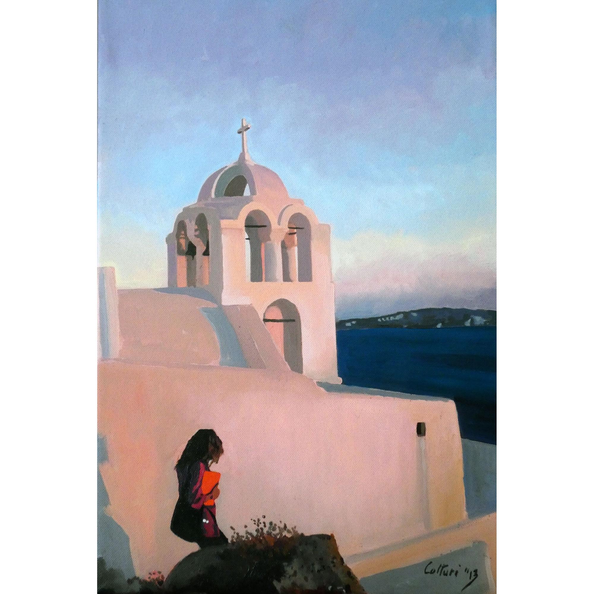 Questo piccolo quadro a olio, firmato Colturi ‘13 e facente parte di una collezione privata, rappresenta con grazia ed essenzialità uno scorcio delle isole greche, Santorini, al tramonto. Protagonista della scena è una chiesa cicladica con cupola e campanile a vela, i cui volumi morbidi e intonacati si tingono delle sfumature rosate e dorate della luce serale, conferendo all’architettura una qualità quasi scultorea.