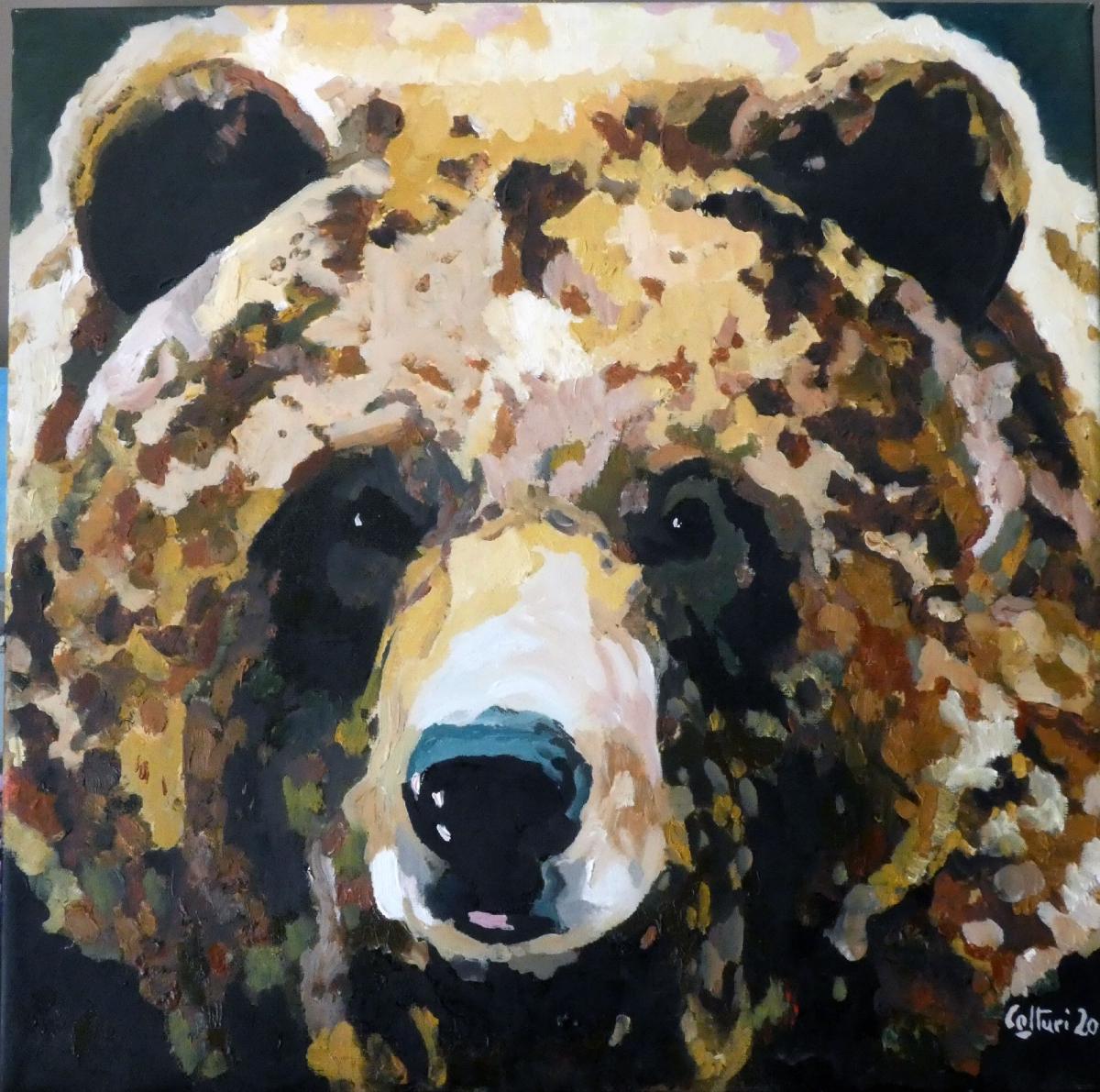 Questo bozzetto a olio, firmato Colturi 2021, rappresenta lo studio preparatorio per un’opera di grandi dimensioni ancora da realizzare. Il soggetto — un orso ritratto frontalmente con lo sguardo fisso e diretto — domina la composizione con una presenza potente e solenne. L’artista sceglie un’inquadratura ravvicinata che elimina ogni contesto narrativo o ambientale, concentrando tutta l’attenzione sul volto dell’animale, vero e proprio emblema di forza, istinto e maestosità.