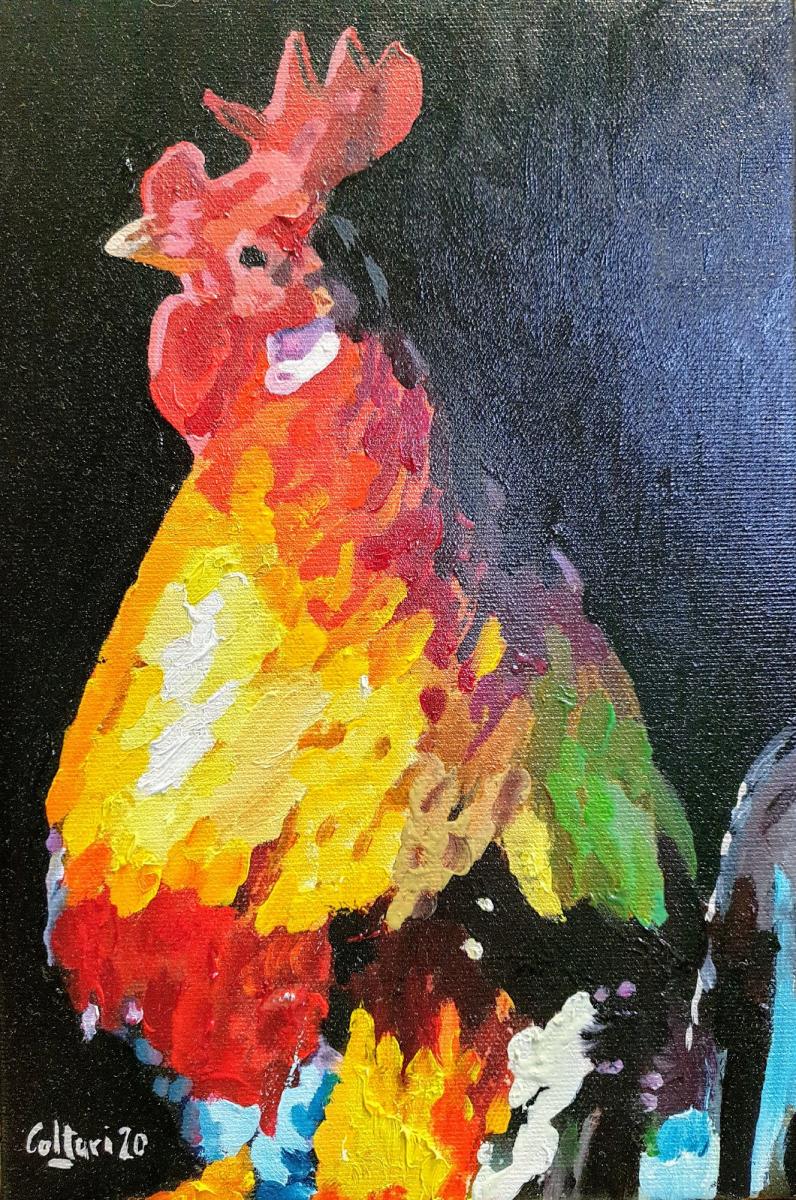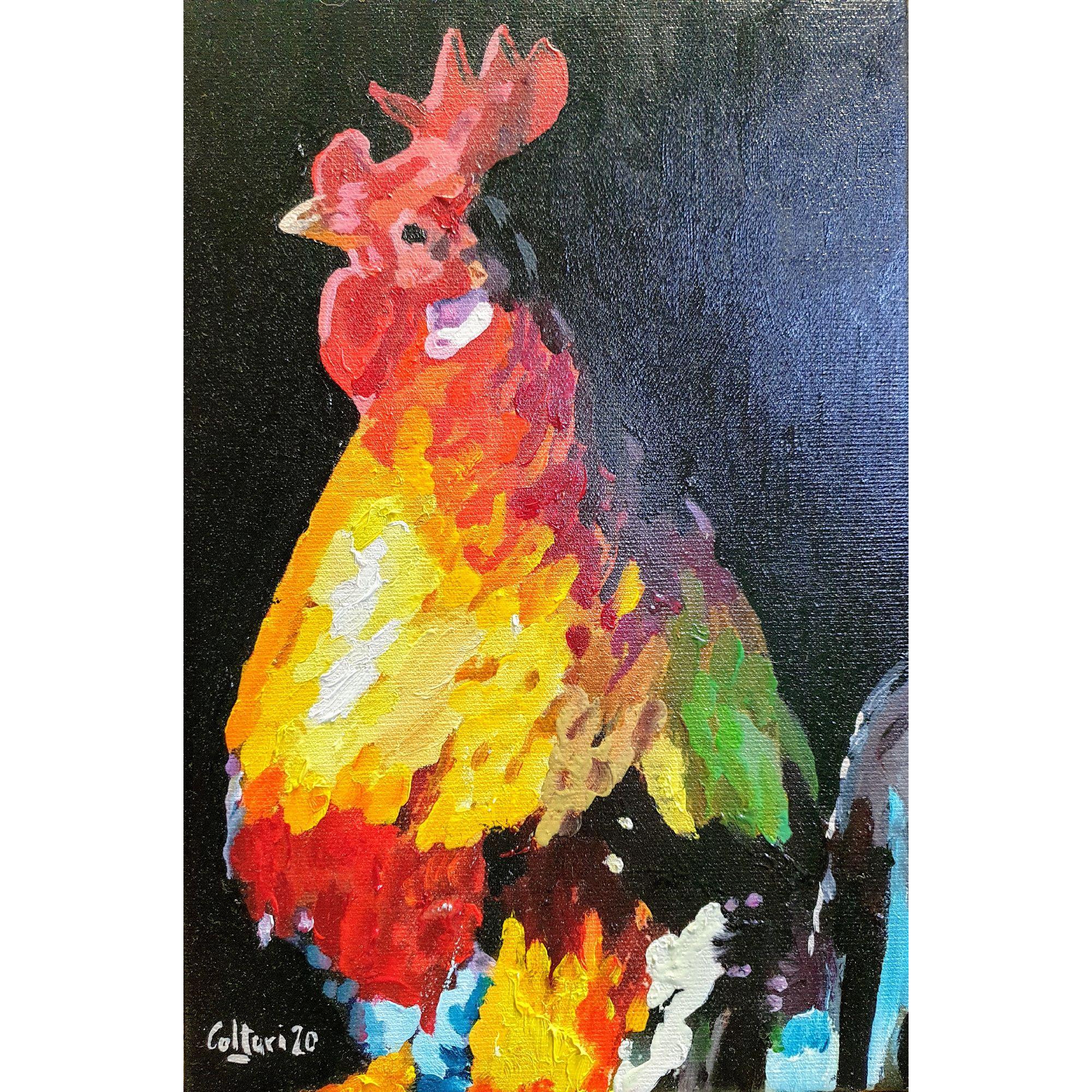 Quest’opera di piccolo formato, , è un’esplosione di colore e materia che ritrae un gallo con energia espressiva e piglio deciso. Le pennellate dense e vibranti, accese da rossi, gialli, aranci e verdi, trasformano il piumaggio dell’animale in una celebrazione cromatica quasi astratta, mentre lo sfondo nero lo esalta con forza teatrale. Un dipinto vivace e iconico, capace di trasformare un soggetto quotidiano in una presenza fiera e carismatica.